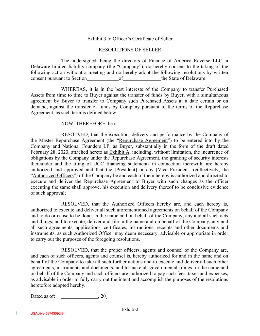 USActive 58743092.9 Exhibit 3 to Officer’s Certificate of Seller RESOLUTIONS OF SELLER The undersigned, being the directors of Finance of America Reverse LLC, a Delaware limited liability company (the “Company”), do hereby consent to the taking of the following action without a meeting and do hereby adopt the following resolutions by written consent pursuant to Section of the State of Delaware: WHEREAS, it is in the best interests of the Company to transfer Purchased Assets from time to time to Buyer against the transfer of funds by Buyer, with a simultaneous agreement by Buyer to transfer to Company such Purchased Assets at a date certain or on demand, against the transfer of funds by Company pursuant to the terms of the Repurchase Agreement, as such term is defined below. NOW, THEREFORE, be it RESOLVED, that the execution, delivery and performance by the Company of the Master Repurchase Agreement (the “Repurchase Agreement”) to be entered into by the Company and National Founders LP, as Buyer, substantially in the form of the draft dated February 28, 2023, attached hereto as Exhibit A, including, without limitation, the incurrence of obligations by the Company under the Repurchase Agreement, the granting of security interests thereunder and the filing of UCC financing statements in connection therewith, are hereby authorized and approved and that the [President] or any [Vice President] (collectively, the “Authorized Officers”) of the Company be and each of them hereby is authorized and directed to execute and deliver the Repurchase Agreement to Buyer with such changes as the officer executing the same shall approve, his execution and delivery thereof to be conclusive evidence of such approval; RESOLVED, that the Authorized Officers hereby are, and each hereby is, authorized to execute and deliver all such aforementioned agreements on behalf of the Company and to do or cause to be done, in the name and on behalf of the Company, any and all such acts and things, and to execute, deliver and file in the name and on behalf of the Company, any and all such agreements, applications, certificates, instructions, receipts and other documents and instruments, as such Authorized Officer may deem necessary, advisable or appropriate in order to carry out the purposes of the foregoing resolutions. RESOLVED, that the proper officers, agents and counsel of the Company are, and each of such officers, agents and counsel is, hereby authorized for and in the name and on behalf of the Company to take all such further actions and to execute and deliver all such other agreements, instruments and documents, and to make all governmental filings, in the name and on behalf of the Company and such officers are authorized to pay such fees, taxes and expenses, as advisable in order to fully carry out the intent and accomplish the purposes of the resolutions heretofore adopted hereby. Dated as of: , 20 Exh. B-3