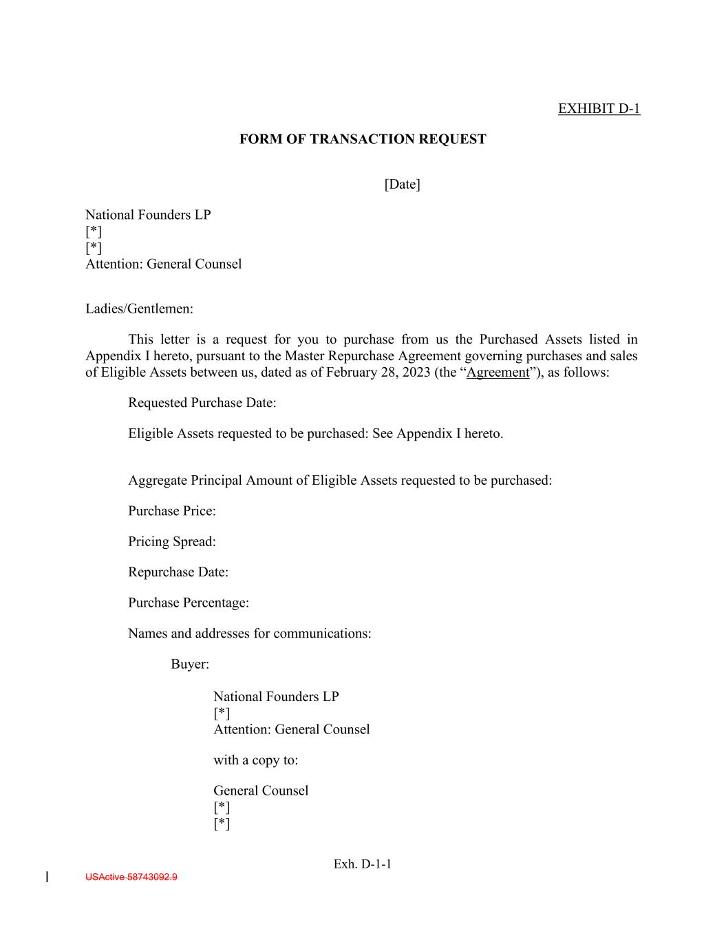 USActive 58743092.9 EXHIBIT D-1 FORM OF TRANSACTION REQUEST [Date] National Founders LP [*] [*] Attention: General Counsel Ladies/Gentlemen: This letter is a request for you to purchase from us the Purchased Assets listed in Appendix I hereto, pursuant to the Master Repurchase Agreement governing purchases and sales of Eligible Assets between us, dated as of February 28, 2023 (the “Agreement”), as follows: Requested Purchase Date: Eligible Assets requested to be purchased: See Appendix I hereto. Aggregate Principal Amount of Eligible Assets requested to be purchased: Purchase Price: Pricing Spread: Repurchase Date: Purchase Percentage: Names and addresses for communications: Buyer: National Founders LP [*] Attention: General Counsel with a copy to: General Counsel [*] [*] Exh. D-1-1