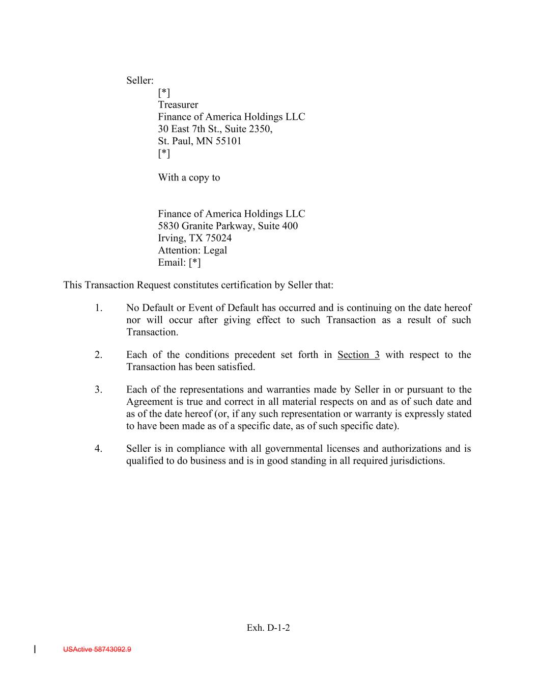 USActive 58743092.9 Seller: [*] Treasurer Finance of America Holdings LLC 30 East 7th St., Suite 2350, St. Paul, MN 55101 [*] With a copy to Finance of America Holdings LLC 5830 Granite Parkway, Suite 400 Irving, TX 75024 Attention: Legal Email: [*] This Transaction Request constitutes certification by Seller that: 1. No Default or Event of Default has occurred and is continuing on the date hereof nor will occur after giving effect to such Transaction as a result of such Transaction. 2. Each of the conditions precedent set forth in Section 3 with respect to the Transaction has been satisfied. 3. Each of the representations and warranties made by Seller in or pursuant to the Agreement is true and correct in all material respects on and as of such date and as of the date hereof (or, if any such representation or warranty is expressly stated to have been made as of a specific date, as of such specific date). 4. Seller is in compliance with all governmental licenses and authorizations and is qualified to do business and is in good standing in all required jurisdictions. Exh. D-1-2