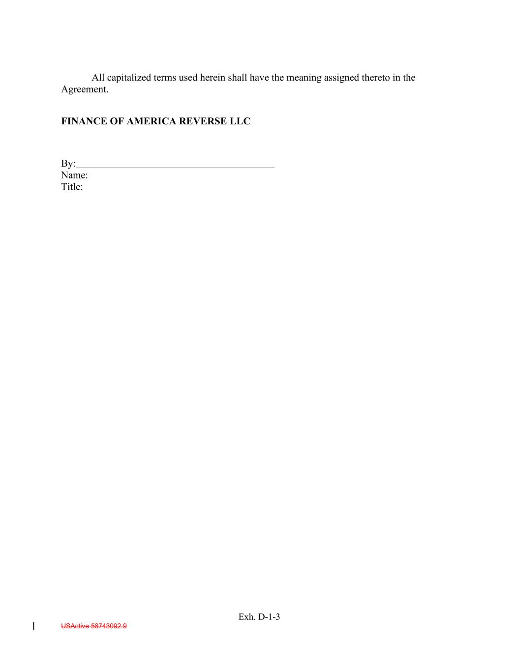 USActive 58743092.9 All capitalized terms used herein shall have the meaning assigned thereto in the Agreement. FINANCE OF AMERICA REVERSE LLC By: Name: Title: Exh. D-1-3