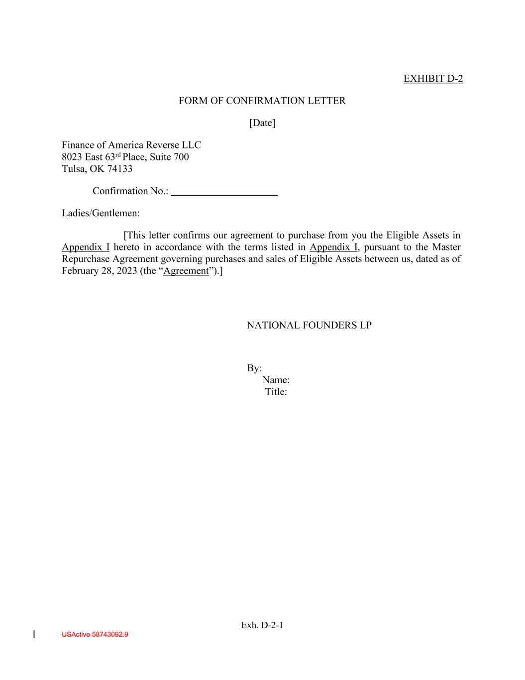 USActive 58743092.9 EXHIBIT D-2 FORM OF CONFIRMATION LETTER [Date] Finance of America Reverse LLC 8023 East 63rd Place, Suite 700 Tulsa, OK 74133 Confirmation No.: Ladies/Gentlemen: [This letter confirms our agreement to purchase from you the Eligible Assets in Appendix I hereto in accordance with the terms listed in Appendix I, pursuant to the Master Repurchase Agreement governing purchases and sales of Eligible Assets between us, dated as of February 28, 2023 (the “Agreement”).] NATIONAL FOUNDERS LP By: Name: Title: Exh. D-2-1