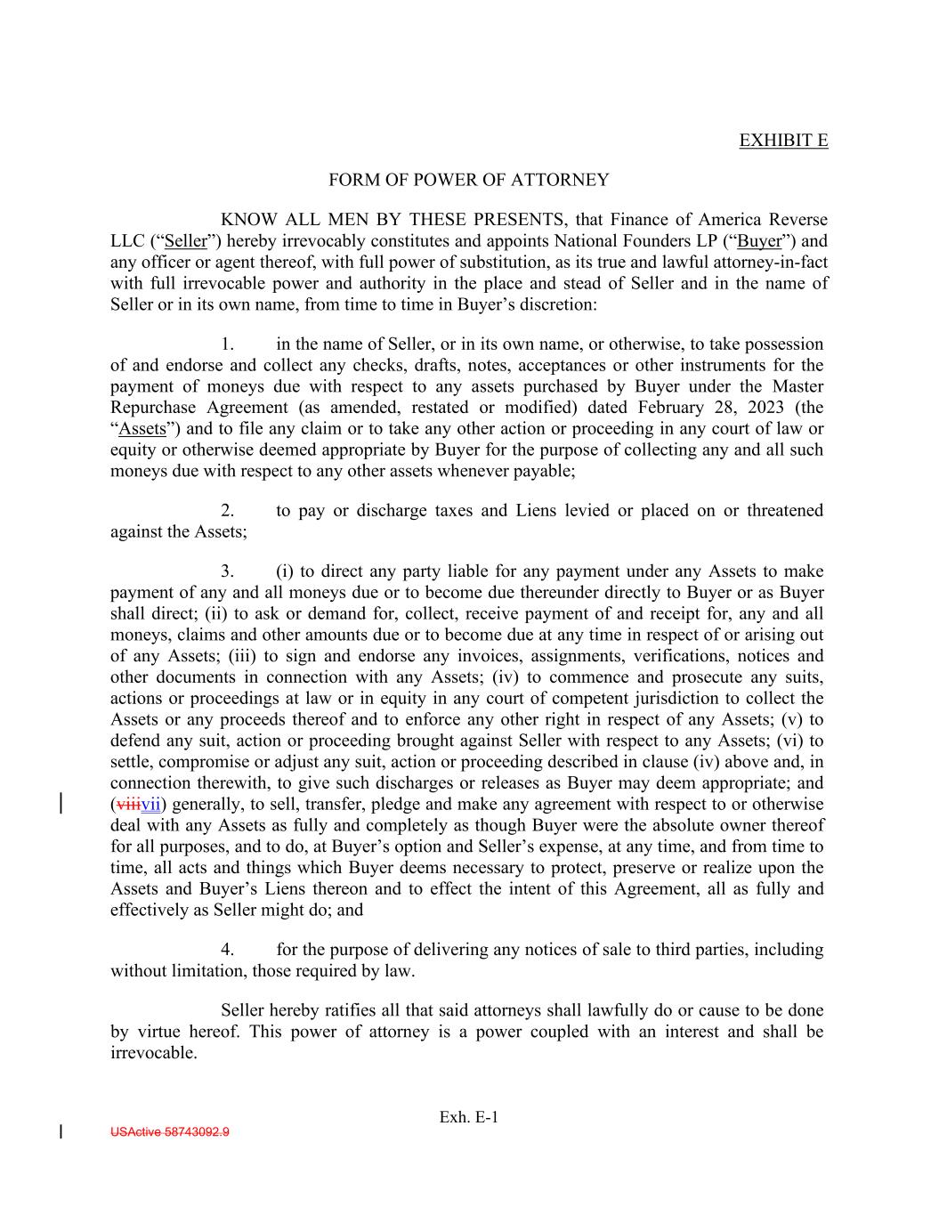 Exh. E-1 USActive 58743092.9 EXHIBIT E FORM OF POWER OF ATTORNEY KNOW ALL MEN BY THESE PRESENTS, that Finance of America Reverse LLC (“Seller”) hereby irrevocably constitutes and appoints National Founders LP (“Buyer”) and any officer or agent thereof, with full power of substitution, as its true and lawful attorney-in-fact with full irrevocable power and authority in the place and stead of Seller and in the name of Seller or in its own name, from time to time in Buyer’s discretion: 1. in the name of Seller, or in its own name, or otherwise, to take possession of and endorse and collect any checks, drafts, notes, acceptances or other instruments for the payment of moneys due with respect to any assets purchased by Buyer under the Master Repurchase Agreement (as amended, restated or modified) dated February 28, 2023 (the “Assets”) and to file any claim or to take any other action or proceeding in any court of law or equity or otherwise deemed appropriate by Buyer for the purpose of collecting any and all such moneys due with respect to any other assets whenever payable; 2. to pay or discharge taxes and Liens levied or placed on or threatened against the Assets; 3. (i) to direct any party liable for any payment under any Assets to make payment of any and all moneys due or to become due thereunder directly to Buyer or as Buyer shall direct; (ii) to ask or demand for, collect, receive payment of and receipt for, any and all moneys, claims and other amounts due or to become due at any time in respect of or arising out of any Assets; (iii) to sign and endorse any invoices, assignments, verifications, notices and other documents in connection with any Assets; (iv) to commence and prosecute any suits, actions or proceedings at law or in equity in any court of competent jurisdiction to collect the Assets or any proceeds thereof and to enforce any other right in respect of any Assets; (v) to defend any suit, action or proceeding brought against Seller with respect to any Assets; (vi) to settle, compromise or adjust any suit, action or proceeding described in clause (iv) above and, in connection therewith, to give such discharges or releases as Buyer may deem appropriate; and (viiivii) generally, to sell, transfer, pledge and make any agreement with respect to or otherwise deal with any Assets as fully and completely as though Buyer were the absolute owner thereof for all purposes, and to do, at Buyer’s option and Seller’s expense, at any time, and from time to time, all acts and things which Buyer deems necessary to protect, preserve or realize upon the Assets and Buyer’s Liens thereon and to effect the intent of this Agreement, all as fully and effectively as Seller might do; and 4. for the purpose of delivering any notices of sale to third parties, including without limitation, those required by law. Seller hereby ratifies all that said attorneys shall lawfully do or cause to be done by virtue hereof. This power of attorney is a power coupled with an interest and shall be irrevocable.
