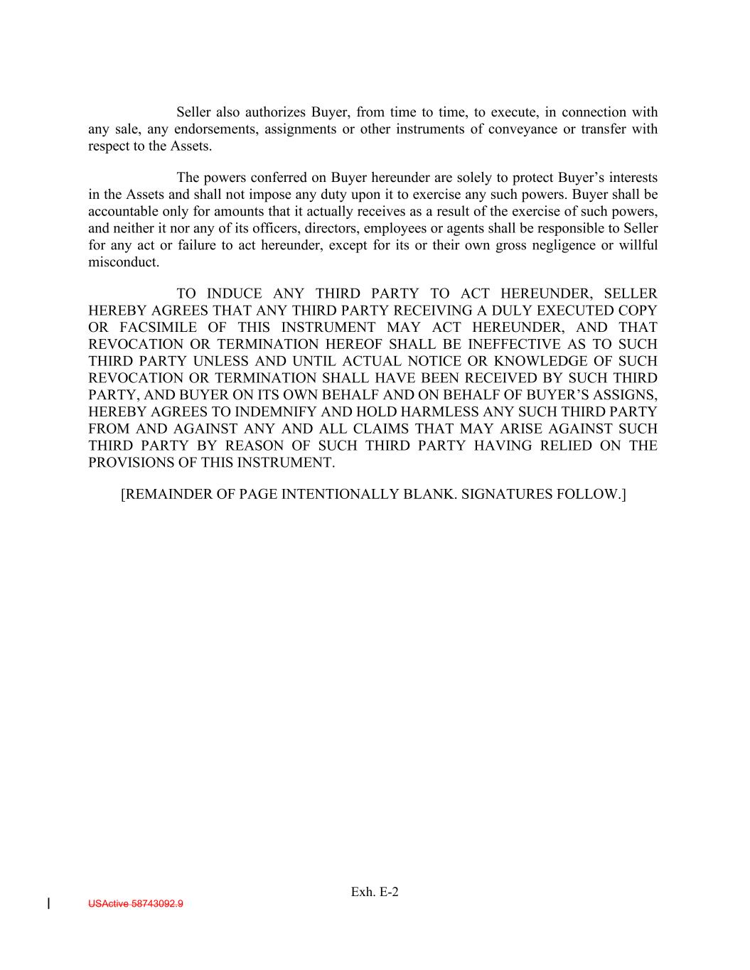 Exh. E-2 USActive 58743092.9 Seller also authorizes Buyer, from time to time, to execute, in connection with any sale, any endorsements, assignments or other instruments of conveyance or transfer with respect to the Assets. The powers conferred on Buyer hereunder are solely to protect Buyer’s interests in the Assets and shall not impose any duty upon it to exercise any such powers. Buyer shall be accountable only for amounts that it actually receives as a result of the exercise of such powers, and neither it nor any of its officers, directors, employees or agents shall be responsible to Seller for any act or failure to act hereunder, except for its or their own gross negligence or willful misconduct. TO INDUCE ANY THIRD PARTY TO ACT HEREUNDER, SELLER HEREBY AGREES THAT ANY THIRD PARTY RECEIVING A DULY EXECUTED COPY OR FACSIMILE OF THIS INSTRUMENT MAY ACT HEREUNDER, AND THAT REVOCATION OR TERMINATION HEREOF SHALL BE INEFFECTIVE AS TO SUCH THIRD PARTY UNLESS AND UNTIL ACTUAL NOTICE OR KNOWLEDGE OF SUCH REVOCATION OR TERMINATION SHALL HAVE BEEN RECEIVED BY SUCH THIRD PARTY, AND BUYER ON ITS OWN BEHALF AND ON BEHALF OF BUYER’S ASSIGNS, HEREBY AGREES TO INDEMNIFY AND HOLD HARMLESS ANY SUCH THIRD PARTY FROM AND AGAINST ANY AND ALL CLAIMS THAT MAY ARISE AGAINST SUCH THIRD PARTY BY REASON OF SUCH THIRD PARTY HAVING RELIED ON THE PROVISIONS OF THIS INSTRUMENT. [REMAINDER OF PAGE INTENTIONALLY BLANK. SIGNATURES FOLLOW.]
