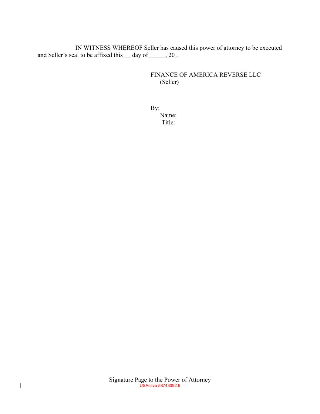 Signature Page to the Power of Attorney USActive 58743092.9 IN WITNESS WHEREOF Seller has caused this power of attorney to be executed and Seller’s seal to be affixed this day of , 20 . FINANCE OF AMERICA REVERSE LLC (Seller) By: Name: Title: