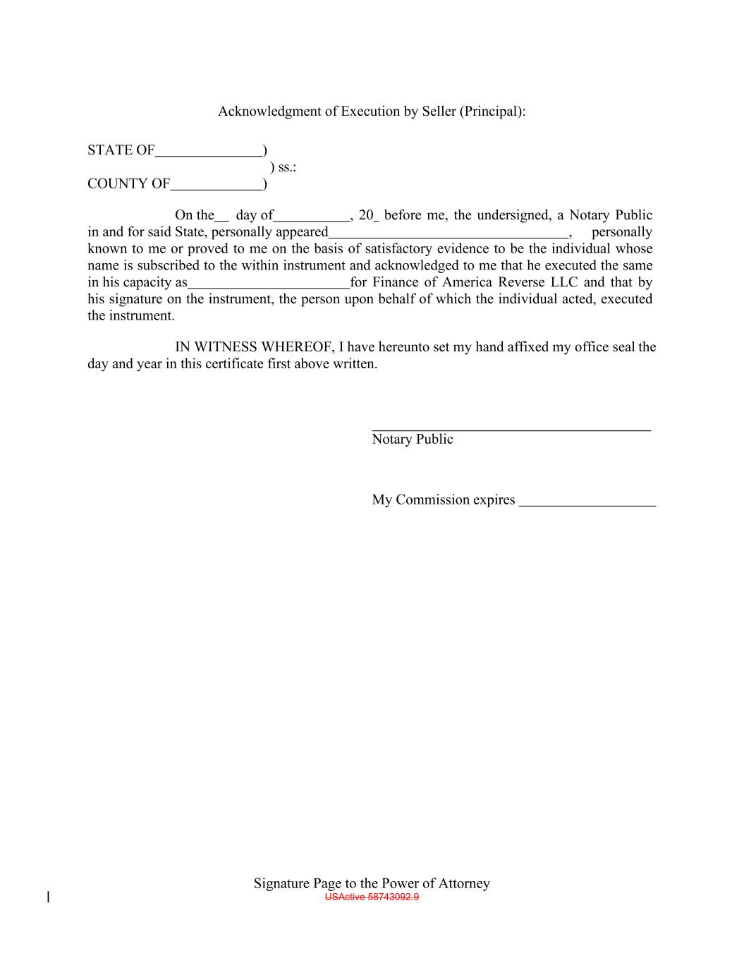 Signature Page to the Power of Attorney USActive 58743092.9 Acknowledgment of Execution by Seller (Principal): STATE OF ) ) ss.: COUNTY OF ) On the day of , 20 before me, the undersigned, a Notary Public in and for said State, personally appeared , personally known to me or proved to me on the basis of satisfactory evidence to be the individual whose name is subscribed to the within instrument and acknowledged to me that he executed the same in his capacity as for Finance of America Reverse LLC and that by his signature on the instrument, the person upon behalf of which the individual acted, executed the instrument. IN WITNESS WHEREOF, I have hereunto set my hand affixed my office seal the day and year in this certificate first above written. Notary Public My Commission expires