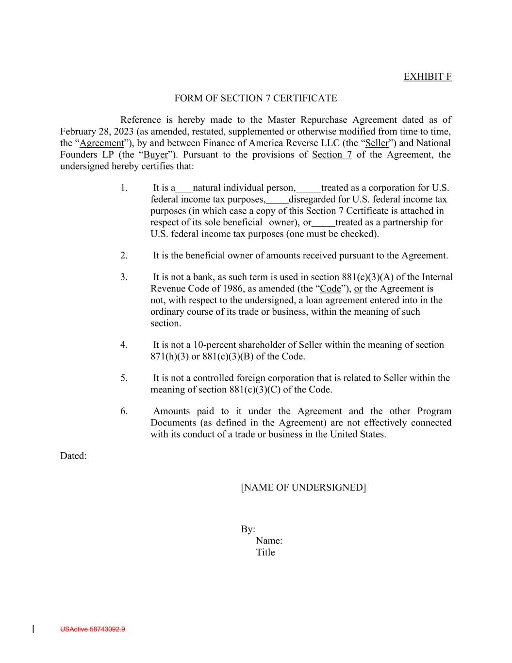 USActive 58743092.9 EXHIBIT F FORM OF SECTION 7 CERTIFICATE Reference is hereby made to the Master Repurchase Agreement dated as of February 28, 2023 (as amended, restated, supplemented or otherwise modified from time to time, the “Agreement”), by and between Finance of America Reverse LLC (the “Seller”) and National Founders LP (the “Buyer”). Pursuant to the provisions of Section 7 of the Agreement, the undersigned hereby certifies that: 1. It is a natural individual person, treated as a corporation for U.S. federal income tax purposes, disregarded for U.S. federal income tax purposes (in which case a copy of this Section 7 Certificate is attached in respect of its sole beneficial owner), or treated as a partnership for U.S. federal income tax purposes (one must be checked). 2. It is the beneficial owner of amounts received pursuant to the Agreement. 3. It is not a bank, as such term is used in section 881(c)(3)(A) of the Internal Revenue Code of 1986, as amended (the “Code”), or the Agreement is not, with respect to the undersigned, a loan agreement entered into in the ordinary course of its trade or business, within the meaning of such section. 4. It is not a 10-percent shareholder of Seller within the meaning of section 871(h)(3) or 881(c)(3)(B) of the Code. 5. It is not a controlled foreign corporation that is related to Seller within the meaning of section 881(c)(3)(C) of the Code. 6. Amounts paid to it under the Agreement and the other Program Documents (as defined in the Agreement) are not effectively connected with its conduct of a trade or business in the United States. Dated: [NAME OF UNDERSIGNED] By: Name: Title