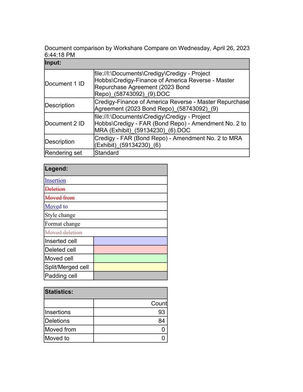 Document comparison by Workshare Compare on Wednesday, April 26, 2023 6:44:18 PM Input: Document 1 ID file://I:\Documents\Credigy\Credigy - Project Hobbs\Credigy-Finance of America Reverse - Master Repurchase Agreement (2023 Bond Repo)_(58743092)_(9).DOC Description Credigy-Finance of America Reverse - Master Repurchase Agreement (2023 Bond Repo)_(58743092)_(9) Document 2 ID file://I:\Documents\Credigy\Credigy - Project Hobbs\Credigy - FAR (Bond Repo) - Amendment No. 2 to MRA (Exhibit)_(59134230)_(6).DOC Description Credigy - FAR (Bond Repo) - Amendment No. 2 to MRA (Exhibit)_(59134230)_(6) Rendering set Standard Legend: Insertion Deletion Moved from Moved to Style change Format change Moved deletion Inserted cell Deleted cell Moved cell Split/Merged cell Padding cell Statistics: Count Insertions 93 Deletions 84 Moved from 0 Moved to 0