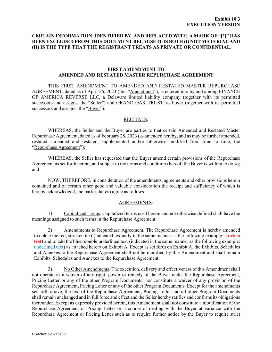 Exhibit 10.3 EXECUTION VERSION CERTAIN INFORMATION, IDENTIFIED BY, AND REPLACED WITH, A MARK OF “[*]” HAS BEEN EXCLUDED FROM THIS DOCUMENT BECAUSE IT IS BOTH (I) NOT MATERIAL AND (II) IS THE TYPE THAT THE REGISTRANT TREATS AS PRIVATE OR CONFIDENTIAL. USActive 59021578.6 FIRST AMENDMENT TO AMENDED AND RESTATED MASTER REPURCHASE AGREEMENT THIS FIRST AMENDMENT TO AMENDED AND RESTATED MASTER REPURCHASE AGREEMENT, dated as of April 26, 2023 (this “Amendment”), is entered into by and among FINANCE OF AMERICA REVERSE LLC, a Delaware limited liability company (together with its permitted successors and assigns, the “Seller”) and GRAND OAK TRUST, as buyer (together with its permitted successors and assigns, the “Buyer”). RECITALS: WHEREAS, the Seller and the Buyer are parties to that certain Amended and Restated Master Repurchase Agreement, dated as of February 28, 2023 (as amended hereby, and as may be further amended, restated, amended and restated, supplemented and/or otherwise modified from time to time, the “Repurchase Agreement”); WHEREAS, the Seller has requested that the Buyer amend certain provisions of the Repurchase Agreement as set forth herein, and subject to the terms and conditions hereof, the Buyer is willing to do so; and NOW, THEREFORE, in consideration of the amendments, agreements and other provisions herein contained and of certain other good and valuable consideration the receipt and sufficiency of which is hereby acknowledged, the parties hereto agree as follows: AGREEMENTS: 1) Capitalized Terms. Capitalized terms used herein and not otherwise defined shall have the meanings assigned to such terms in the Repurchase Agreement. 2) Amendments to Repurchase Agreement. The Repurchase Agreement is hereby amended to delete the red, stricken text (indicated textually in the same manner as the following example: stricken text) and to add the blue, double underlined text (indicated in the same manner as the following example: underlined text) as attached hereto on Exhibit A. Except as set forth on Exhibit A, the Exhibits, Schedules and Annexes to the Repurchase Agreement shall not be modified by this Amendment and shall remain Exhibits, Schedules and Annexes to the Repurchase Agreement. 3) No Other Amendments. The execution, delivery and effectiveness of this Amendment shall not operate as a waiver of any right, power or remedy of the Buyer under the Repurchase Agreement, Pricing Letter or any of the other Program Documents, nor constitute a waiver of any provision of the Repurchase Agreement, Pricing Letter or any of the other Program Documents. Except for the amendments set forth above, the text of the Repurchase Agreement, Pricing Letter and all other Program Documents shall remain unchanged and in full force and effect and the Seller hereby ratifies and confirms its obligations thereunder. Except as expressly provided herein, this Amendment shall not constitute a modification of the Repurchase Agreement or Pricing Letter or a course of dealing with the Buyer at variance with the Repurchase Agreement or Pricing Letter such as to require further notice by the Buyer to require strict