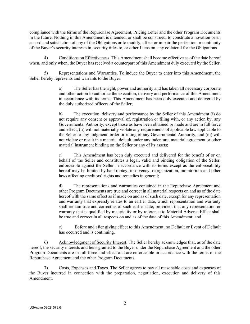 2 USActive 59021578.6 compliance with the terms of the Repurchase Agreement, Pricing Letter and the other Program Documents in the future. Nothing in this Amendment is intended, or shall be construed, to constitute a novation or an accord and satisfaction of any of the Obligations or to modify, affect or impair the perfection or continuity of the Buyer’s security interests in, security titles to, or other Liens on, any collateral for the Obligations. 4) Conditions on Effectiveness. This Amendment shall become effective as of the date hereof when, and only when, the Buyer has received a counterpart of this Amendment duly executed by the Seller. 5) Representations and Warranties. To induce the Buyer to enter into this Amendment, the Seller hereby represents and warrants to the Buyer: a) The Seller has the right, power and authority and has taken all necessary corporate and other action to authorize the execution, delivery and performance of this Amendment in accordance with its terms. This Amendment has been duly executed and delivered by the duly authorized officers of the Seller; b) The execution, delivery and performance by the Seller of this Amendment (i) do not require any consent or approval of, registration or filing with, or any action by, any Governmental Authority, except those as have been obtained or made and are in full force and effect, (ii) will not materially violate any requirements of applicable law applicable to the Seller or any judgment, order or ruling of any Governmental Authority, and (iii) will not violate or result in a material default under any indenture, material agreement or other material instrument binding on the Seller or any of its assets; c) This Amendment has been duly executed and delivered for the benefit of or on behalf of the Seller and constitutes a legal, valid and binding obligation of the Seller, enforceable against the Seller in accordance with its terms except as the enforceability hereof may be limited by bankruptcy, insolvency, reorganization, moratorium and other laws affecting creditors’ rights and remedies in general; d) The representations and warranties contained in the Repurchase Agreement and other Program Documents are true and correct in all material respects on and as of the date hereof with the same effect as if made on and as of such date, except for any representation and warranty that expressly relates to an earlier date, which representation and warranty shall remain true and correct as of such earlier date; provided, that any representation or warranty that is qualified by materiality or by reference to Material Adverse Effect shall be true and correct in all respects on and as of the date of this Amendment; and e) Before and after giving effect to this Amendment, no Default or Event of Default has occurred and is continuing. 6) Acknowledgment of Security Interest. The Seller hereby acknowledges that, as of the date hereof, the security interests and liens granted to the Buyer under the Repurchase Agreement and the other Program Documents are in full force and effect and are enforceable in accordance with the terms of the Repurchase Agreement and the other Program Documents. 7) Costs, Expenses and Taxes. The Seller agrees to pay all reasonable costs and expenses of the Buyer incurred in connection with the preparation, negotiation, execution and delivery of this Amendment.