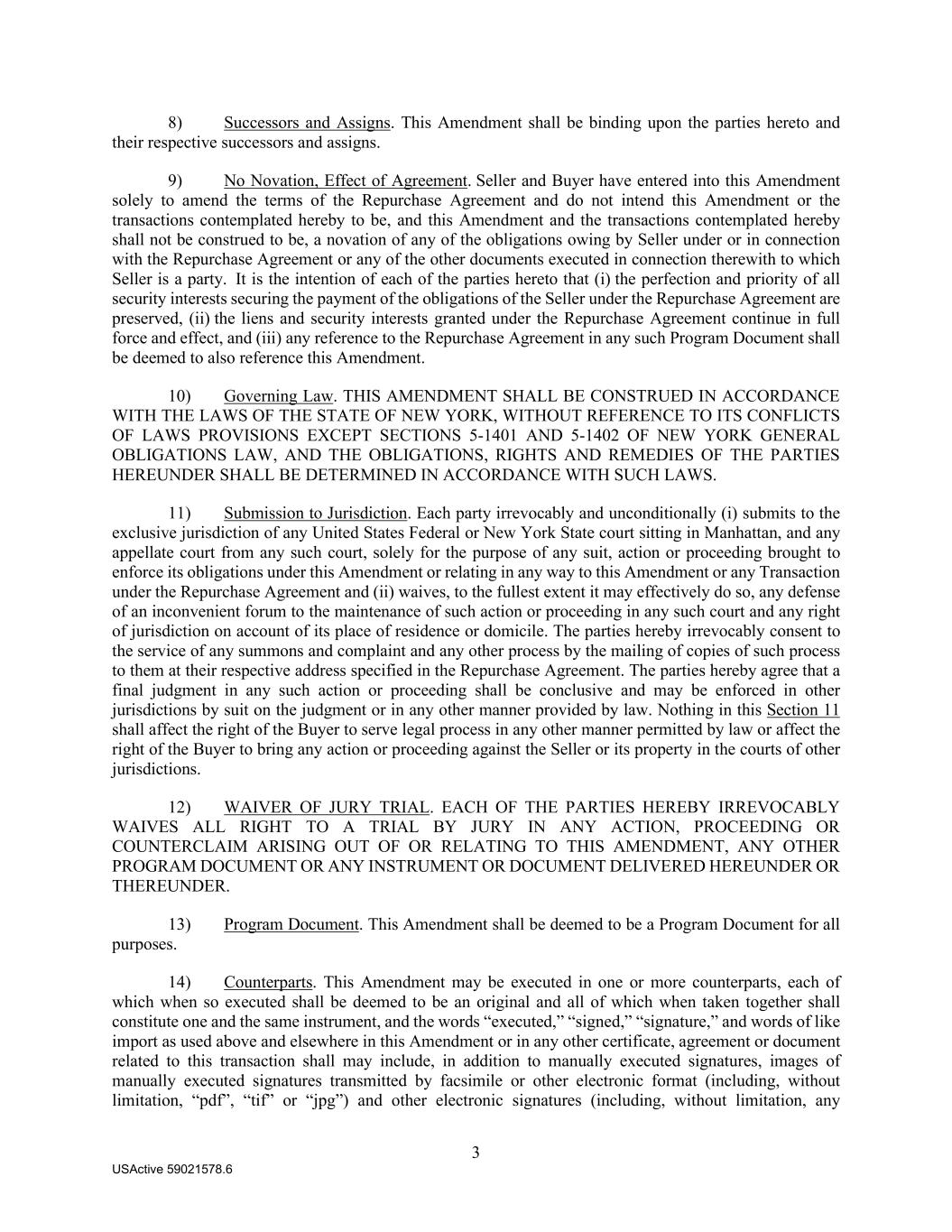 3 USActive 59021578.6 8) Successors and Assigns. This Amendment shall be binding upon the parties hereto and their respective successors and assigns. 9) No Novation, Effect of Agreement. Seller and Buyer have entered into this Amendment solely to amend the terms of the Repurchase Agreement and do not intend this Amendment or the transactions contemplated hereby to be, and this Amendment and the transactions contemplated hereby shall not be construed to be, a novation of any of the obligations owing by Seller under or in connection with the Repurchase Agreement or any of the other documents executed in connection therewith to which Seller is a party. It is the intention of each of the parties hereto that (i) the perfection and priority of all security interests securing the payment of the obligations of the Seller under the Repurchase Agreement are preserved, (ii) the liens and security interests granted under the Repurchase Agreement continue in full force and effect, and (iii) any reference to the Repurchase Agreement in any such Program Document shall be deemed to also reference this Amendment. 10) Governing Law. THIS AMENDMENT SHALL BE CONSTRUED IN ACCORDANCE WITH THE LAWS OF THE STATE OF NEW YORK, WITHOUT REFERENCE TO ITS CONFLICTS OF LAWS PROVISIONS EXCEPT SECTIONS 5-1401 AND 5-1402 OF NEW YORK GENERAL OBLIGATIONS LAW, AND THE OBLIGATIONS, RIGHTS AND REMEDIES OF THE PARTIES HEREUNDER SHALL BE DETERMINED IN ACCORDANCE WITH SUCH LAWS. 11) Submission to Jurisdiction. Each party irrevocably and unconditionally (i) submits to the exclusive jurisdiction of any United States Federal or New York State court sitting in Manhattan, and any appellate court from any such court, solely for the purpose of any suit, action or proceeding brought to enforce its obligations under this Amendment or relating in any way to this Amendment or any Transaction under the Repurchase Agreement and (ii) waives, to the fullest extent it may effectively do so, any defense of an inconvenient forum to the maintenance of such action or proceeding in any such court and any right of jurisdiction on account of its place of residence or domicile. The parties hereby irrevocably consent to the service of any summons and complaint and any other process by the mailing of copies of such process to them at their respective address specified in the Repurchase Agreement. The parties hereby agree that a final judgment in any such action or proceeding shall be conclusive and may be enforced in other jurisdictions by suit on the judgment or in any other manner provided by law. Nothing in this Section 11 shall affect the right of the Buyer to serve legal process in any other manner permitted by law or affect the right of the Buyer to bring any action or proceeding against the Seller or its property in the courts of other jurisdictions. 12) WAIVER OF JURY TRIAL. EACH OF THE PARTIES HEREBY IRREVOCABLY WAIVES ALL RIGHT TO A TRIAL BY JURY IN ANY ACTION, PROCEEDING OR COUNTERCLAIM ARISING OUT OF OR RELATING TO THIS AMENDMENT, ANY OTHER PROGRAM DOCUMENT OR ANY INSTRUMENT OR DOCUMENT DELIVERED HEREUNDER OR THEREUNDER. 13) Program Document. This Amendment shall be deemed to be a Program Document for all purposes. 14) Counterparts. This Amendment may be executed in one or more counterparts, each of which when so executed shall be deemed to be an original and all of which when taken together shall constitute one and the same instrument, and the words “executed,” “signed,” “signature,” and words of like import as used above and elsewhere in this Amendment or in any other certificate, agreement or document related to this transaction shall may include, in addition to manually executed signatures, images of manually executed signatures transmitted by facsimile or other electronic format (including, without limitation, “pdf”, “tif” or “jpg”) and other electronic signatures (including, without limitation, any