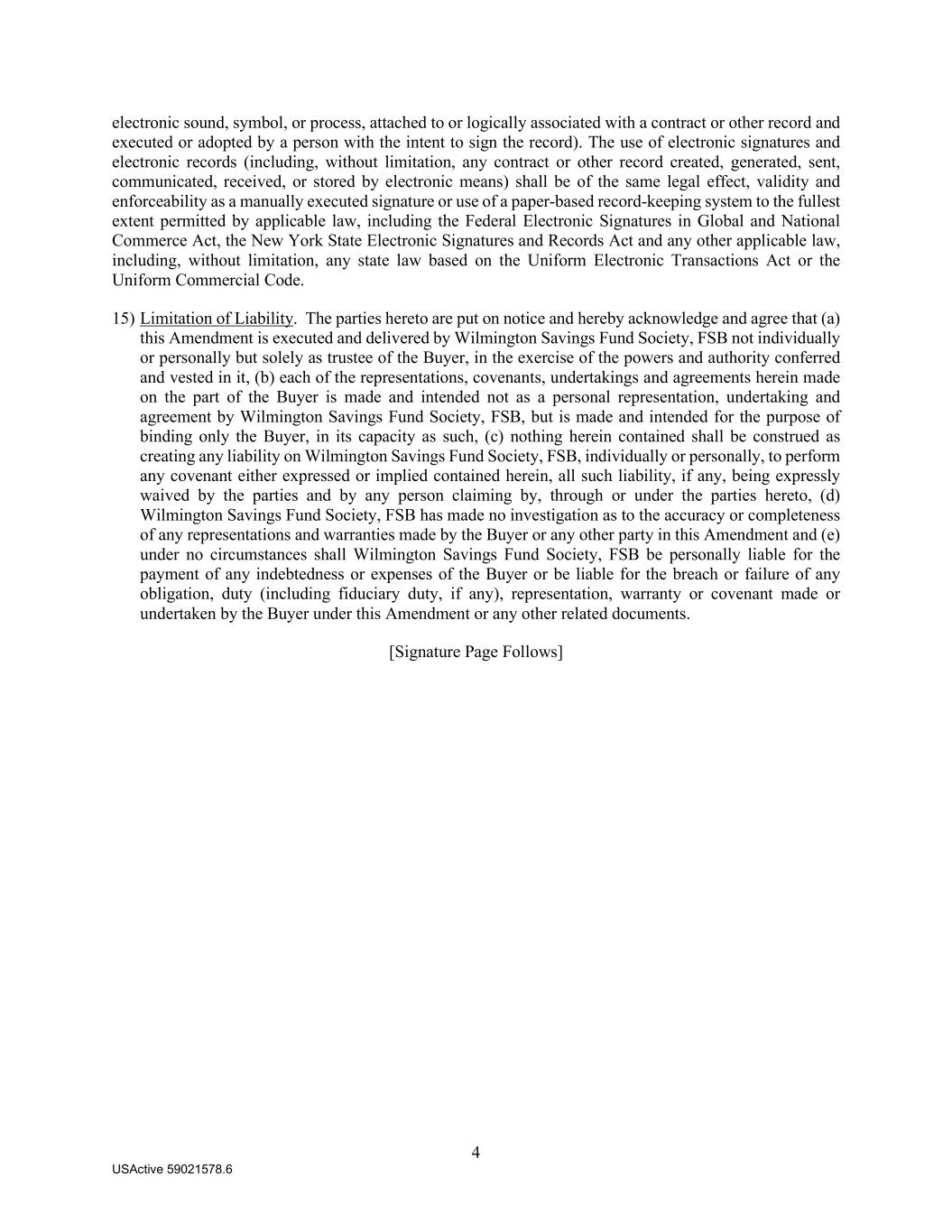4 USActive 59021578.6 electronic sound, symbol, or process, attached to or logically associated with a contract or other record and executed or adopted by a person with the intent to sign the record). The use of electronic signatures and electronic records (including, without limitation, any contract or other record created, generated, sent, communicated, received, or stored by electronic means) shall be of the same legal effect, validity and enforceability as a manually executed signature or use of a paper-based record-keeping system to the fullest extent permitted by applicable law, including the Federal Electronic Signatures in Global and National Commerce Act, the New York State Electronic Signatures and Records Act and any other applicable law, including, without limitation, any state law based on the Uniform Electronic Transactions Act or the Uniform Commercial Code. 15) Limitation of Liability. The parties hereto are put on notice and hereby acknowledge and agree that (a) this Amendment is executed and delivered by Wilmington Savings Fund Society, FSB not individually or personally but solely as trustee of the Buyer, in the exercise of the powers and authority conferred and vested in it, (b) each of the representations, covenants, undertakings and agreements herein made on the part of the Buyer is made and intended not as a personal representation, undertaking and agreement by Wilmington Savings Fund Society, FSB, but is made and intended for the purpose of binding only the Buyer, in its capacity as such, (c) nothing herein contained shall be construed as creating any liability on Wilmington Savings Fund Society, FSB, individually or personally, to perform any covenant either expressed or implied contained herein, all such liability, if any, being expressly waived by the parties and by any person claiming by, through or under the parties hereto, (d) Wilmington Savings Fund Society, FSB has made no investigation as to the accuracy or completeness of any representations and warranties made by the Buyer or any other party in this Amendment and (e) under no circumstances shall Wilmington Savings Fund Society, FSB be personally liable for the payment of any indebtedness or expenses of the Buyer or be liable for the breach or failure of any obligation, duty (including fiduciary duty, if any), representation, warranty or covenant made or undertaken by the Buyer under this Amendment or any other related documents. [Signature Page Follows]