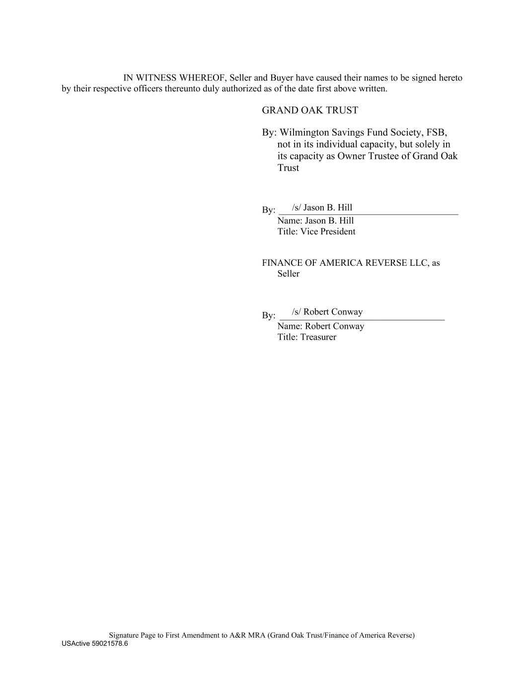 Signature Page to First Amendment to A&R MRA (Grand Oak Trust/Finance of America Reverse) USActive 59021578.6 /s/ Robert Conway /s/ Jason B. Hill IN WITNESS WHEREOF, Seller and Buyer have caused their names to be signed hereto by their respective officers thereunto duly authorized as of the date first above written. GRAND OAK TRUST By: Wilmington Savings Fund Society, FSB, not in its individual capacity, but solely in its capacity as Owner Trustee of Grand Oak Trust By: ______________________________________ Name: Jason B. Hill Title: Vice President FINANCE OF AMERICA REVERSE LLC, as Seller By: ___________________________________ Name: Robert Conway Title: Treasurer