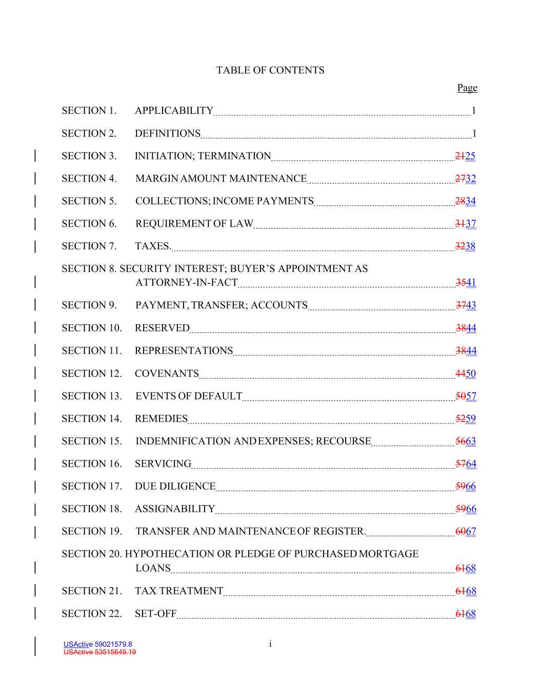 i USActive 59021579.8 USActive 53515649.19 TABLE OF CONTENTS Page SECTION 1. APPLICABILITY 1 SECTION 2. DEFINITIONS 1 SECTION 3. INITIATION; TERMINATION 2125 SECTION 4. MARGIN AMOUNT MAINTENANCE 2732 SECTION 5. COLLECTIONS; INCOME PAYMENTS 2834 SECTION 6. REQUIREMENT OF LAW 3137 SECTION 7. TAXES. 3238 SECTION 8. SECURITY INTEREST; BUYER’S APPOINTMENT AS ATTORNEY-IN-FACT 3541 SECTION 9. PAYMENT, TRANSFER; ACCOUNTS 3743 SECTION 10. RESERVED 3844 SECTION 11. REPRESENTATIONS 3844 SECTION 12. COVENANTS 4450 SECTION 13. EVENTS OF DEFAULT 5057 SECTION 14. REMEDIES 5259 SECTION 15. INDEMNIFICATION AND EXPENSES; RECOURSE 5663 SECTION 16. SERVICING 5764 SECTION 17. DUE DILIGENCE 5966 SECTION 18. ASSIGNABILITY 5966 SECTION 19. TRANSFER AND MAINTENANCE OF REGISTER. 6067 SECTION 20. HYPOTHECATION OR PLEDGE OF PURCHASED MORTGAGE LOANS 6168 SECTION 21. TAX TREATMENT 6168 SECTION 22. SET-OFF 6168