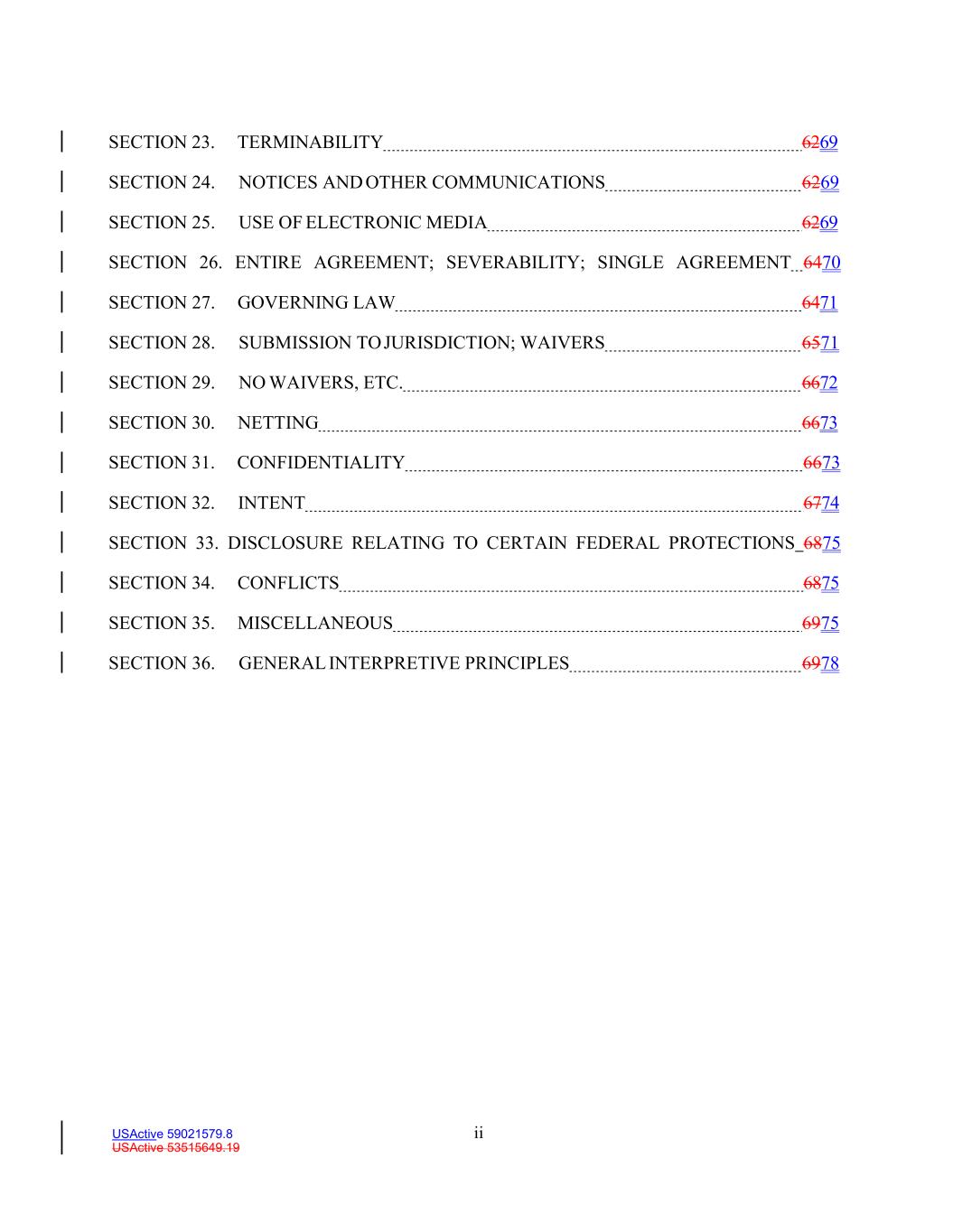 ii USActive 59021579.8 USActive 53515649.19 SECTION 23. TERMINABILITY 6269 SECTION 24. NOTICES AND OTHER COMMUNICATIONS 6269 SECTION 25. USE OF ELECTRONIC MEDIA 6269 SECTION 26. ENTIRE AGREEMENT; SEVERABILITY; SINGLE AGREEMENT 6470 SECTION 27. GOVERNING LAW 6471 SECTION 28. SUBMISSION TO JURISDICTION; WAIVERS 6571 SECTION 29. NO WAIVERS, ETC. 6672 SECTION 30. NETTING 6673 SECTION 31. CONFIDENTIALITY 6673 SECTION 32. INTENT 6774 SECTION 33. DISCLOSURE RELATING TO CERTAIN FEDERAL PROTECTIONS 6875 SECTION 34. CONFLICTS 6875 SECTION 35. MISCELLANEOUS 6975 SECTION 36. GENERAL INTERPRETIVE PRINCIPLES 6978