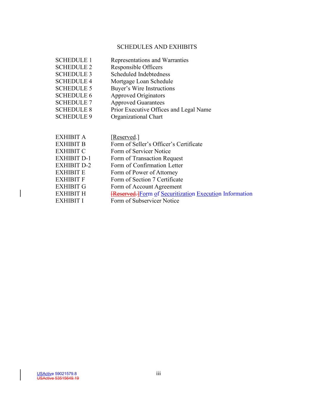 iii USActive 59021579.8 USActive 53515649.19 SCHEDULES AND EXHIBITS SCHEDULE 1 Representations and Warranties SCHEDULE 2 Responsible Officers SCHEDULE 3 Scheduled Indebtedness SCHEDULE 4 Mortgage Loan Schedule SCHEDULE 5 Buyer’s Wire Instructions SCHEDULE 6 Approved Originators SCHEDULE 7 Approved Guarantees SCHEDULE 8 Prior Executive Offices and Legal Name SCHEDULE 9 Organizational Chart EXHIBIT A [Reserved.] EXHIBIT B Form of Seller’s Officer’s Certificate EXHIBIT C Form of Servicer Notice EXHIBIT D-1 Form of Transaction Request EXHIBIT D-2 Form of Confirmation Letter EXHIBIT E Form of Power of Attorney EXHIBIT F Form of Section 7 Certificate EXHIBIT G Form of Account Agreement EXHIBIT H [Reserved.]Form of Securitization Execution Information EXHIBIT I Form of Subservicer Notice