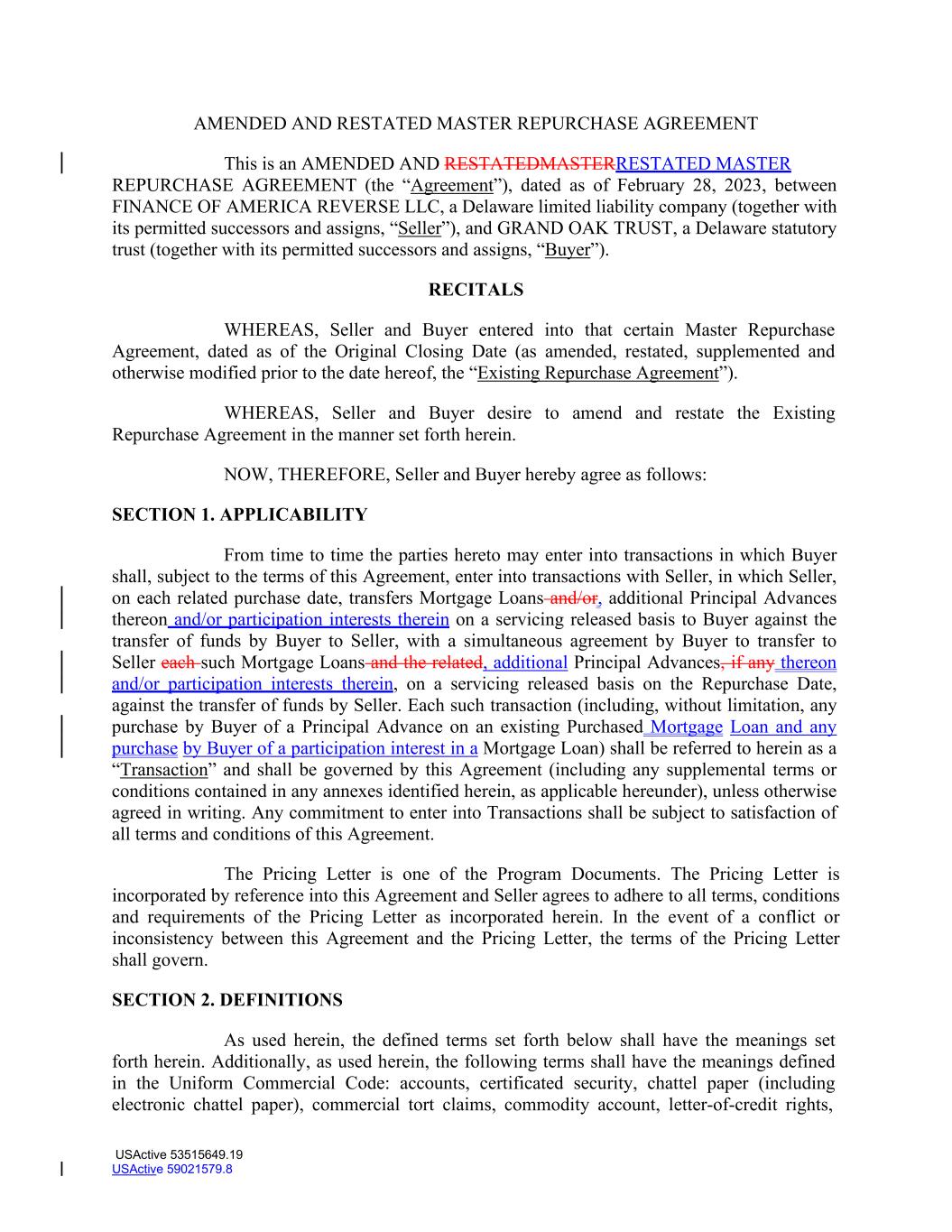 AMENDED AND RESTATED MASTER REPURCHASE AGREEMENT This is an AMENDED AND RESTATEDMASTERRESTATED MASTER REPURCHASE AGREEMENT (the “Agreement”), dated as of February 28, 2023, between FINANCE OF AMERICA REVERSE LLC, a Delaware limited liability company (together with its permitted successors and assigns, “Seller”), and GRAND OAK TRUST, a Delaware statutory trust (together with its permitted successors and assigns, “Buyer”). RECITALS WHEREAS, Seller and Buyer entered into that certain Master Repurchase Agreement, dated as of the Original Closing Date (as amended, restated, supplemented and otherwise modified prior to the date hereof, the “Existing Repurchase Agreement”). WHEREAS, Seller and Buyer desire to amend and restate the Existing Repurchase Agreement in the manner set forth herein. NOW, THEREFORE, Seller and Buyer hereby agree as follows: SECTION 1. APPLICABILITY From time to time the parties hereto may enter into transactions in which Buyer shall, subject to the terms of this Agreement, enter into transactions with Seller, in which Seller, on each related purchase date, transfers Mortgage Loans and/or, additional Principal Advances thereon and/or participation interests therein on a servicing released basis to Buyer against the transfer of funds by Buyer to Seller, with a simultaneous agreement by Buyer to transfer to Seller each such Mortgage Loans and the related, additional Principal Advances, if any thereon and/or participation interests therein, on a servicing released basis on the Repurchase Date, against the transfer of funds by Seller. Each such transaction (including, without limitation, any purchase by Buyer of a Principal Advance on an existing Purchased Mortgage Loan and any purchase by Buyer of a participation interest in a Mortgage Loan) shall be referred to herein as a “Transaction” and shall be governed by this Agreement (including any supplemental terms or conditions contained in any annexes identified herein, as applicable hereunder), unless otherwise agreed in writing. Any commitment to enter into Transactions shall be subject to satisfaction of all terms and conditions of this Agreement. The Pricing Letter is one of the Program Documents. The Pricing Letter is incorporated by reference into this Agreement and Seller agrees to adhere to all terms, conditions and requirements of the Pricing Letter as incorporated herein. In the event of a conflict or inconsistency between this Agreement and the Pricing Letter, the terms of the Pricing Letter shall govern. SECTION 2. DEFINITIONS As used herein, the defined terms set forth below shall have the meanings set forth herein. Additionally, as used herein, the following terms shall have the meanings defined in the Uniform Commercial Code: accounts, certificated security, chattel paper (including electronic chattel paper), commercial tort claims, commodity account, letter-of-credit rights, USActive 53515649.19 USActive 59021579.8
