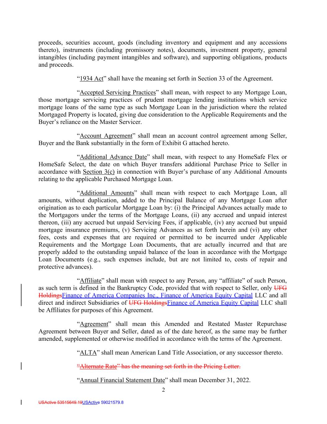 2 USActive 53515649.19USActive 59021579.8 proceeds, securities account, goods (including inventory and equipment and any accessions thereto), instruments (including promissory notes), documents, investment property, general intangibles (including payment intangibles and software), and supporting obligations, products and proceeds. “1934 Act” shall have the meaning set forth in Section 33 of the Agreement. “Accepted Servicing Practices” shall mean, with respect to any Mortgage Loan, those mortgage servicing practices of prudent mortgage lending institutions which service mortgage loans of the same type as such Mortgage Loan in the jurisdiction where the related Mortgaged Property is located, giving due consideration to the Applicable Requirements and the Buyer’s reliance on the Master Servicer. “Account Agreement” shall mean an account control agreement among Seller, Buyer and the Bank substantially in the form of Exhibit G attached hereto. “Additional Advance Date” shall mean, with respect to any HomeSafe Flex or HomeSafe Select, the date on which Buyer transfers additional Purchase Price to Seller in accordance with Section 3(c) in connection with Buyer’s purchase of any Additional Amounts relating to the applicable Purchased Mortgage Loan. “Additional Amounts” shall mean with respect to each Mortgage Loan, all amounts, without duplication, added to the Principal Balance of any Mortgage Loan after origination as to each particular Mortgage Loan by: (i) the Principal Advances actually made to the Mortgagors under the terms of the Mortgage Loans, (ii) any accrued and unpaid interest thereon, (iii) any accrued but unpaid Servicing Fees, if applicable, (iv) any accrued but unpaid mortgage insurance premiums, (v) Servicing Advances as set forth herein and (vi) any other fees, costs and expenses that are required or permitted to be incurred under Applicable Requirements and the Mortgage Loan Documents, that are actually incurred and that are properly added to the outstanding unpaid balance of the loan in accordance with the Mortgage Loan Documents (e.g., such expenses include, but are not limited to, costs of repair and protective advances). “Affiliate” shall mean with respect to any Person, any “affiliate” of such Person, as such term is defined in the Bankruptcy Code, provided that with respect to Seller, only UFG HoldingsFinance of America Companies Inc., Finance of America Equity Capital LLC and all direct and indirect Subsidiaries of UFG HoldingsFinance of America Equity Capital LLC shall be Affiliates for purposes of this Agreement. “Agreement” shall mean this Amended and Restated Master Repurchase Agreement between Buyer and Seller, dated as of the date hereof, as the same may be further amended, supplemented or otherwise modified in accordance with the terms of the Agreement. “ALTA” shall mean American Land Title Association, or any successor thereto. “Alternate Rate” has the meaning set forth in the Pricing Letter. “Annual Financial Statement Date” shall mean December 31, 2022.