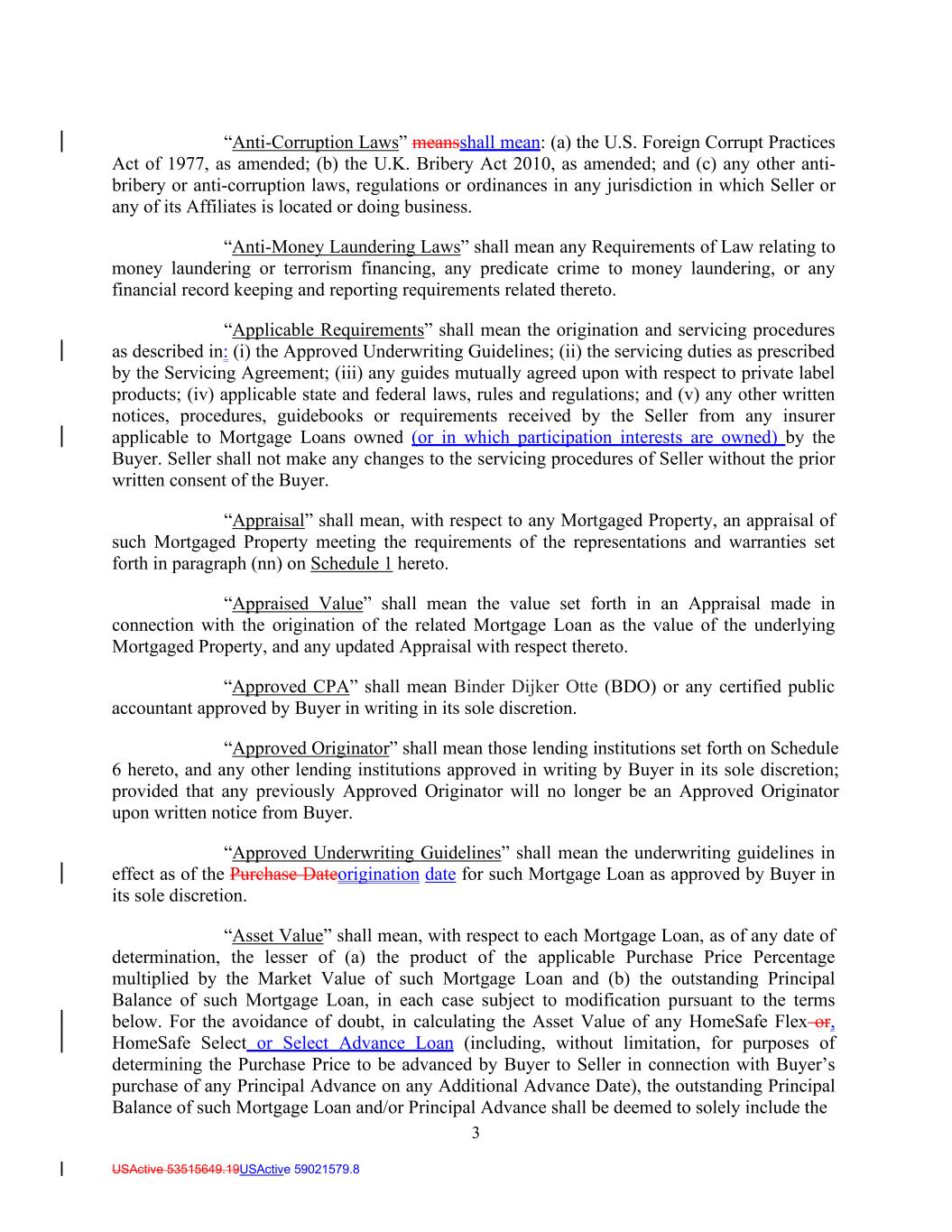 3 USActive 53515649.19USActive 59021579.8 “Anti-Corruption Laws” meansshall mean: (a) the U.S. Foreign Corrupt Practices Act of 1977, as amended; (b) the U.K. Bribery Act 2010, as amended; and (c) any other anti- bribery or anti-corruption laws, regulations or ordinances in any jurisdiction in which Seller or any of its Affiliates is located or doing business. “Anti-Money Laundering Laws” shall mean any Requirements of Law relating to money laundering or terrorism financing, any predicate crime to money laundering, or any financial record keeping and reporting requirements related thereto. “Applicable Requirements” shall mean the origination and servicing procedures as described in: (i) the Approved Underwriting Guidelines; (ii) the servicing duties as prescribed by the Servicing Agreement; (iii) any guides mutually agreed upon with respect to private label products; (iv) applicable state and federal laws, rules and regulations; and (v) any other written notices, procedures, guidebooks or requirements received by the Seller from any insurer applicable to Mortgage Loans owned (or in which participation interests are owned) by the Buyer. Seller shall not make any changes to the servicing procedures of Seller without the prior written consent of the Buyer. “Appraisal” shall mean, with respect to any Mortgaged Property, an appraisal of such Mortgaged Property meeting the requirements of the representations and warranties set forth in paragraph (nn) on Schedule 1 hereto. “Appraised Value” shall mean the value set forth in an Appraisal made in connection with the origination of the related Mortgage Loan as the value of the underlying Mortgaged Property, and any updated Appraisal with respect thereto. “Approved CPA” shall mean Binder Dijker Otte (BDO) or any certified public accountant approved by Buyer in writing in its sole discretion. “Approved Originator” shall mean those lending institutions set forth on Schedule 6 hereto, and any other lending institutions approved in writing by Buyer in its sole discretion; provided that any previously Approved Originator will no longer be an Approved Originator upon written notice from Buyer. “Approved Underwriting Guidelines” shall mean the underwriting guidelines in effect as of the Purchase Dateorigination date for such Mortgage Loan as approved by Buyer in its sole discretion. “Asset Value” shall mean, with respect to each Mortgage Loan, as of any date of determination, the lesser of (a) the product of the applicable Purchase Price Percentage multiplied by the Market Value of such Mortgage Loan and (b) the outstanding Principal Balance of such Mortgage Loan, in each case subject to modification pursuant to the terms below. For the avoidance of doubt, in calculating the Asset Value of any HomeSafe Flex or, HomeSafe Select or Select Advance Loan (including, without limitation, for purposes of determining the Purchase Price to be advanced by Buyer to Seller in connection with Buyer’s purchase of any Principal Advance on any Additional Advance Date), the outstanding Principal Balance of such Mortgage Loan and/or Principal Advance shall be deemed to solely include the