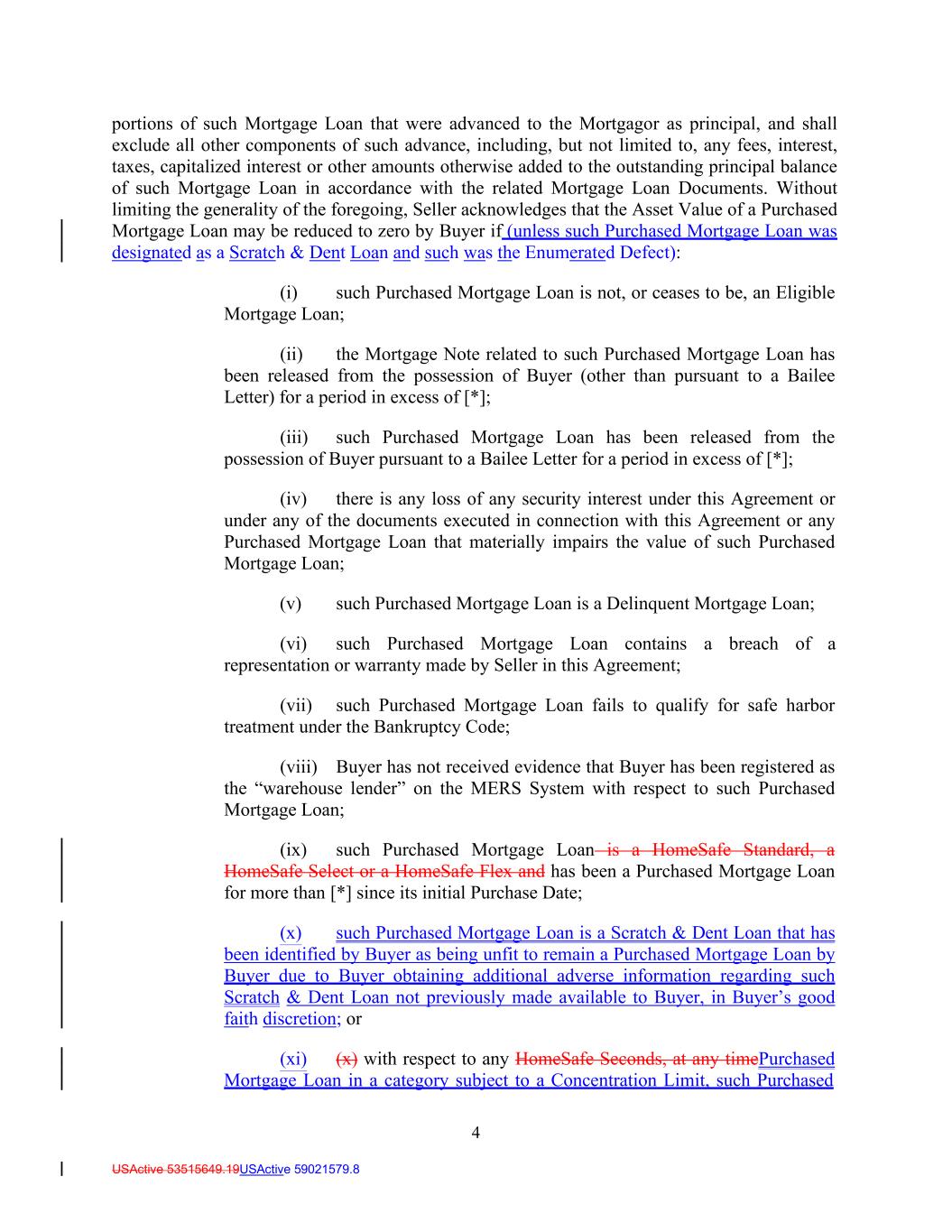 4 USActive 53515649.19USActive 59021579.8 portions of such Mortgage Loan that were advanced to the Mortgagor as principal, and shall exclude all other components of such advance, including, but not limited to, any fees, interest, taxes, capitalized interest or other amounts otherwise added to the outstanding principal balance of such Mortgage Loan in accordance with the related Mortgage Loan Documents. Without limiting the generality of the foregoing, Seller acknowledges that the Asset Value of a Purchased Mortgage Loan may be reduced to zero by Buyer if (unless such Purchased Mortgage Loan was designated as a Scratch & Dent Loan and such was the Enumerated Defect): (i) such Purchased Mortgage Loan is not, or ceases to be, an Eligible Mortgage Loan; (ii) the Mortgage Note related to such Purchased Mortgage Loan has been released from the possession of Buyer (other than pursuant to a Bailee Letter) for a period in excess of [*]; (iii) such Purchased Mortgage Loan has been released from the possession of Buyer pursuant to a Bailee Letter for a period in excess of [*]; (iv) there is any loss of any security interest under this Agreement or under any of the documents executed in connection with this Agreement or any Purchased Mortgage Loan that materially impairs the value of such Purchased Mortgage Loan; (v) such Purchased Mortgage Loan is a Delinquent Mortgage Loan; (vi) such Purchased Mortgage Loan contains a breach of a representation or warranty made by Seller in this Agreement; (vii) such Purchased Mortgage Loan fails to qualify for safe harbor treatment under the Bankruptcy Code; (viii) Buyer has not received evidence that Buyer has been registered as the “warehouse lender” on the MERS System with respect to such Purchased Mortgage Loan; (ix) such Purchased Mortgage Loan is a HomeSafe Standard, a HomeSafe Select or a HomeSafe Flex and has been a Purchased Mortgage Loan for more than [*] since its initial Purchase Date; (x) such Purchased Mortgage Loan is a Scratch & Dent Loan that has been identified by Buyer as being unfit to remain a Purchased Mortgage Loan by Buyer due to Buyer obtaining additional adverse information regarding such Scratch & Dent Loan not previously made available to Buyer, in Buyer’s good faith discretion; or (xi) (x) with respect to any HomeSafe Seconds, at any timePurchased Mortgage Loan in a category subject to a Concentration Limit, such Purchased