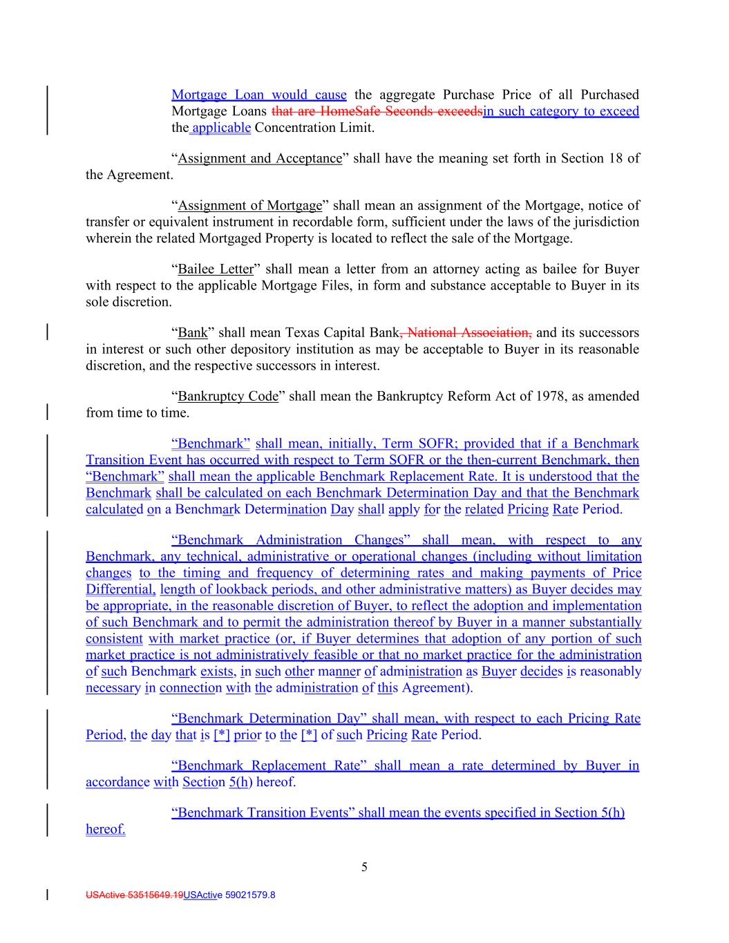 5 USActive 53515649.19USActive 59021579.8 Mortgage Loan would cause the aggregate Purchase Price of all Purchased Mortgage Loans that are HomeSafe Seconds exceedsin such category to exceed the applicable Concentration Limit. “Assignment and Acceptance” shall have the meaning set forth in Section 18 of the Agreement. “Assignment of Mortgage” shall mean an assignment of the Mortgage, notice of transfer or equivalent instrument in recordable form, sufficient under the laws of the jurisdiction wherein the related Mortgaged Property is located to reflect the sale of the Mortgage. “Bailee Letter” shall mean a letter from an attorney acting as bailee for Buyer with respect to the applicable Mortgage Files, in form and substance acceptable to Buyer in its sole discretion. “Bank” shall mean Texas Capital Bank, National Association, and its successors in interest or such other depository institution as may be acceptable to Buyer in its reasonable discretion, and the respective successors in interest. “Bankruptcy Code” shall mean the Bankruptcy Reform Act of 1978, as amended from time to time. “Benchmark” shall mean, initially, Term SOFR; provided that if a Benchmark Transition Event has occurred with respect to Term SOFR or the then-current Benchmark, then “Benchmark” shall mean the applicable Benchmark Replacement Rate. It is understood that the Benchmark shall be calculated on each Benchmark Determination Day and that the Benchmark calculated on a Benchmark Determination Day shall apply for the related Pricing Rate Period. “Benchmark Administration Changes” shall mean, with respect to any Benchmark, any technical, administrative or operational changes (including without limitation changes to the timing and frequency of determining rates and making payments of Price Differential, length of lookback periods, and other administrative matters) as Buyer decides may be appropriate, in the reasonable discretion of Buyer, to reflect the adoption and implementation of such Benchmark and to permit the administration thereof by Buyer in a manner substantially consistent with market practice (or, if Buyer determines that adoption of any portion of such market practice is not administratively feasible or that no market practice for the administration of such Benchmark exists, in such other manner of administration as Buyer decides is reasonably necessary in connection with the administration of this Agreement). “Benchmark Determination Day” shall mean, with respect to each Pricing Rate Period, the day that is [*] prior to the [*] of such Pricing Rate Period. “Benchmark Replacement Rate” shall mean a rate determined by Buyer in accordance with Section 5(h) hereof. “Benchmark Transition Events” shall mean the events specified in Section 5(h) hereof.
