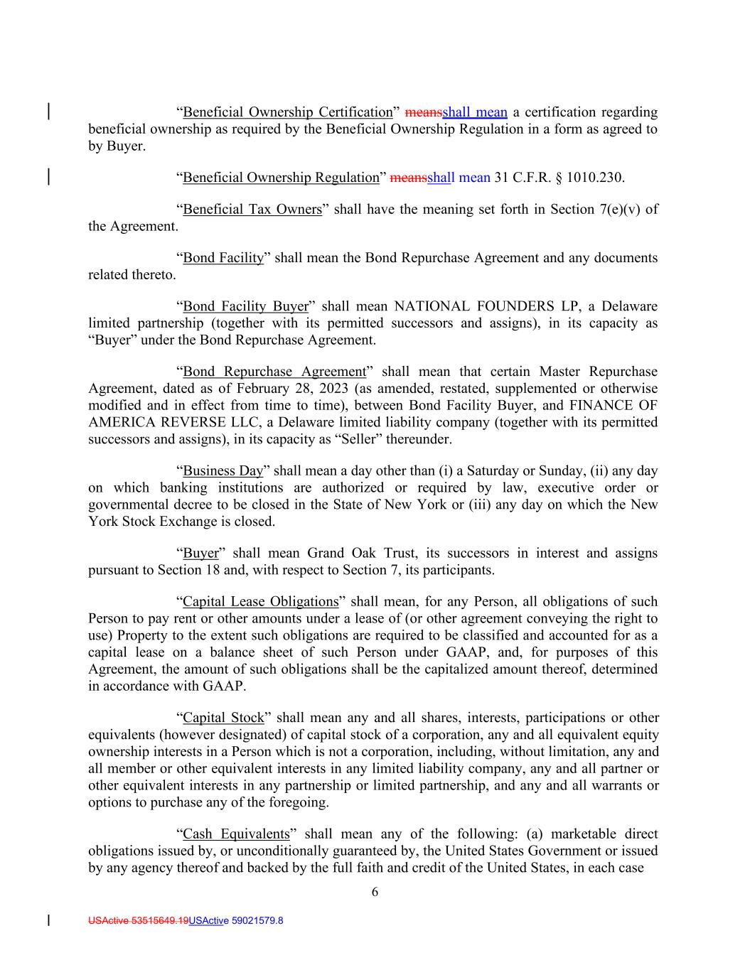 6 USActive 53515649.19USActive 59021579.8 “Beneficial Ownership Certification” meansshall mean a certification regarding beneficial ownership as required by the Beneficial Ownership Regulation in a form as agreed to by Buyer. “Beneficial Ownership Regulation” meansshall mean 31 C.F.R. § 1010.230. “Beneficial Tax Owners” shall have the meaning set forth in Section 7(e)(v) of the Agreement. “Bond Facility” shall mean the Bond Repurchase Agreement and any documents related thereto. “Bond Facility Buyer” shall mean NATIONAL FOUNDERS LP, a Delaware limited partnership (together with its permitted successors and assigns), in its capacity as “Buyer” under the Bond Repurchase Agreement. “Bond Repurchase Agreement” shall mean that certain Master Repurchase Agreement, dated as of February 28, 2023 (as amended, restated, supplemented or otherwise modified and in effect from time to time), between Bond Facility Buyer, and FINANCE OF AMERICA REVERSE LLC, a Delaware limited liability company (together with its permitted successors and assigns), in its capacity as “Seller” thereunder. “Business Day” shall mean a day other than (i) a Saturday or Sunday, (ii) any day on which banking institutions are authorized or required by law, executive order or governmental decree to be closed in the State of New York or (iii) any day on which the New York Stock Exchange is closed. “Buyer” shall mean Grand Oak Trust, its successors in interest and assigns pursuant to Section 18 and, with respect to Section 7, its participants. “Capital Lease Obligations” shall mean, for any Person, all obligations of such Person to pay rent or other amounts under a lease of (or other agreement conveying the right to use) Property to the extent such obligations are required to be classified and accounted for as a capital lease on a balance sheet of such Person under GAAP, and, for purposes of this Agreement, the amount of such obligations shall be the capitalized amount thereof, determined in accordance with GAAP. “Capital Stock” shall mean any and all shares, interests, participations or other equivalents (however designated) of capital stock of a corporation, any and all equivalent equity ownership interests in a Person which is not a corporation, including, without limitation, any and all member or other equivalent interests in any limited liability company, any and all partner or other equivalent interests in any partnership or limited partnership, and any and all warrants or options to purchase any of the foregoing. “Cash Equivalents” shall mean any of the following: (a) marketable direct obligations issued by, or unconditionally guaranteed by, the United States Government or issued by any agency thereof and backed by the full faith and credit of the United States, in each case
