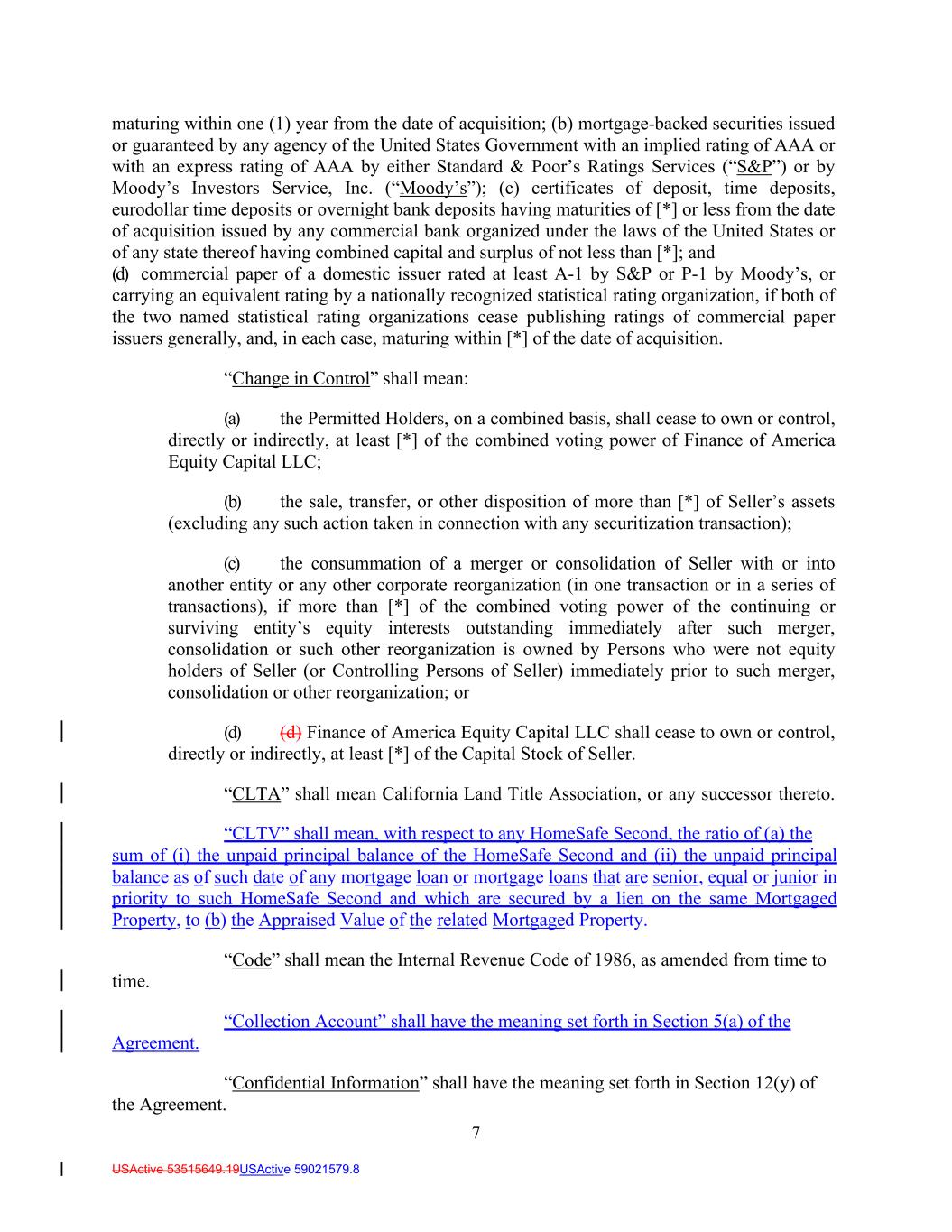 7 USActive 53515649.19USActive 59021579.8 maturing within one (1) year from the date of acquisition; (b) mortgage-backed securities issued or guaranteed by any agency of the United States Government with an implied rating of AAA or with an express rating of AAA by either Standard & Poor’s Ratings Services (“S&P”) or by Moody’s Investors Service, Inc. (“Moody’s”); (c) certificates of deposit, time deposits, eurodollar time deposits or overnight bank deposits having maturities of [*] or less from the date of acquisition issued by any commercial bank organized under the laws of the United States or of any state thereof having combined capital and surplus of not less than [*]; and (d) commercial paper of a domestic issuer rated at least A-1 by S&P or P-1 by Moody’s, or carrying an equivalent rating by a nationally recognized statistical rating organization, if both of the two named statistical rating organizations cease publishing ratings of commercial paper issuers generally, and, in each case, maturing within [*] of the date of acquisition. “Change in Control” shall mean: (a) the Permitted Holders, on a combined basis, shall cease to own or control, directly or indirectly, at least [*] of the combined voting power of Finance of America Equity Capital LLC; (b) the sale, transfer, or other disposition of more than [*] of Seller’s assets (excluding any such action taken in connection with any securitization transaction); (c) the consummation of a merger or consolidation of Seller with or into another entity or any other corporate reorganization (in one transaction or in a series of transactions), if more than [*] of the combined voting power of the continuing or surviving entity’s equity interests outstanding immediately after such merger, consolidation or such other reorganization is owned by Persons who were not equity holders of Seller (or Controlling Persons of Seller) immediately prior to such merger, consolidation or other reorganization; or (d) (d) Finance of America Equity Capital LLC shall cease to own or control, directly or indirectly, at least [*] of the Capital Stock of Seller. “CLTA” shall mean California Land Title Association, or any successor thereto. “CLTV” shall mean, with respect to any HomeSafe Second, the ratio of (a) the sum of (i) the unpaid principal balance of the HomeSafe Second and (ii) the unpaid principal balance as of such date of any mortgage loan or mortgage loans that are senior, equal or junior in priority to such HomeSafe Second and which are secured by a lien on the same Mortgaged Property, to (b) the Appraised Value of the related Mortgaged Property. “Code” shall mean the Internal Revenue Code of 1986, as amended from time to time. Agreement. “Collection Account” shall have the meaning set forth in Section 5(a) of the “Confidential Information” shall have the meaning set forth in Section 12(y) of the Agreement.