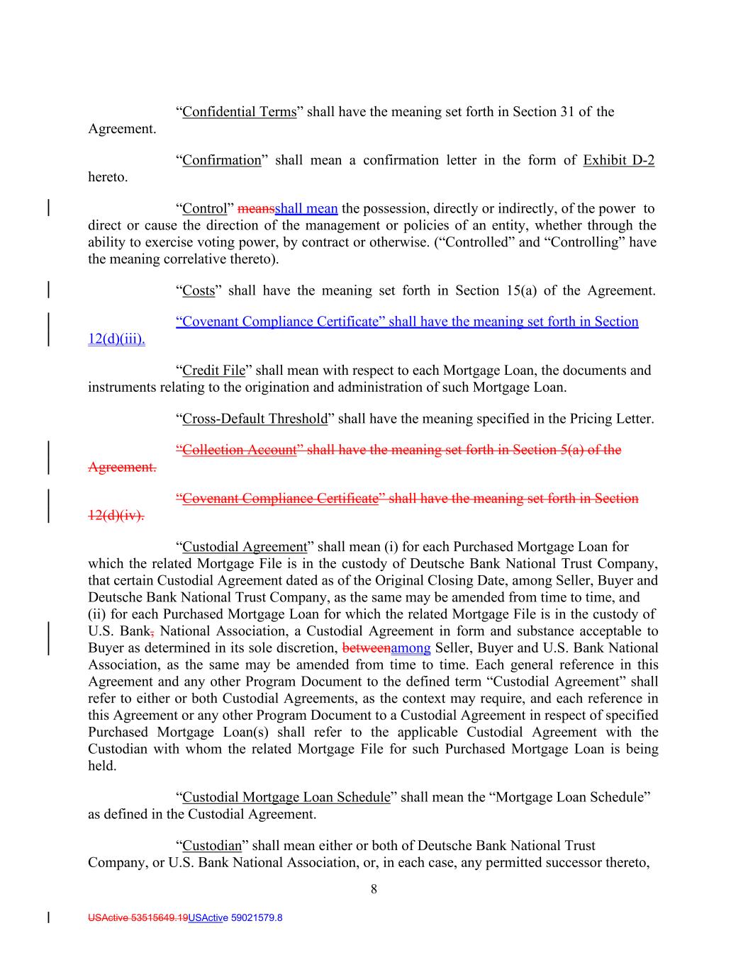 8 USActive 53515649.19USActive 59021579.8 Agreement. hereto. “Confidential Terms” shall have the meaning set forth in Section 31 of the “Confirmation” shall mean a confirmation letter in the form of Exhibit D-2 “Control” meansshall mean the possession, directly or indirectly, of the power to direct or cause the direction of the management or policies of an entity, whether through the ability to exercise voting power, by contract or otherwise. (“Controlled” and “Controlling” have the meaning correlative thereto). “Costs” shall have the meaning set forth in Section 15(a) of the Agreement. “Covenant Compliance Certificate” shall have the meaning set forth in Section 12(d)(iii). “Credit File” shall mean with respect to each Mortgage Loan, the documents and instruments relating to the origination and administration of such Mortgage Loan. “Cross-Default Threshold” shall have the meaning specified in the Pricing Letter. “Collection Account” shall have the meaning set forth in Section 5(a) of the Agreement. 12(d)(iv). “Covenant Compliance Certificate” shall have the meaning set forth in Section “Custodial Agreement” shall mean (i) for each Purchased Mortgage Loan for which the related Mortgage File is in the custody of Deutsche Bank National Trust Company, that certain Custodial Agreement dated as of the Original Closing Date, among Seller, Buyer and Deutsche Bank National Trust Company, as the same may be amended from time to time, and (ii) for each Purchased Mortgage Loan for which the related Mortgage File is in the custody of U.S. Bank, National Association, a Custodial Agreement in form and substance acceptable to Buyer as determined in its sole discretion, betweenamong Seller, Buyer and U.S. Bank National Association, as the same may be amended from time to time. Each general reference in this Agreement and any other Program Document to the defined term “Custodial Agreement” shall refer to either or both Custodial Agreements, as the context may require, and each reference in this Agreement or any other Program Document to a Custodial Agreement in respect of specified Purchased Mortgage Loan(s) shall refer to the applicable Custodial Agreement with the Custodian with whom the related Mortgage File for such Purchased Mortgage Loan is being held. “Custodial Mortgage Loan Schedule” shall mean the “Mortgage Loan Schedule” as defined in the Custodial Agreement. “Custodian” shall mean either or both of Deutsche Bank National Trust Company, or U.S. Bank National Association, or, in each case, any permitted successor thereto,