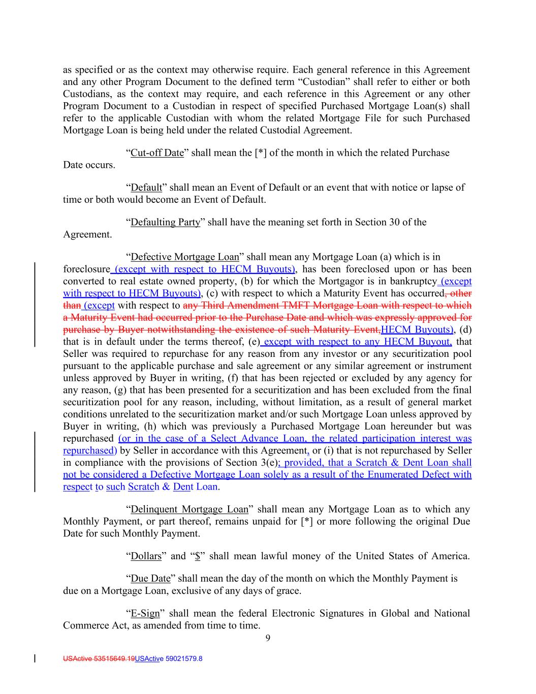 9 USActive 53515649.19USActive 59021579.8 as specified or as the context may otherwise require. Each general reference in this Agreement and any other Program Document to the defined term “Custodian” shall refer to either or both Custodians, as the context may require, and each reference in this Agreement or any other Program Document to a Custodian in respect of specified Purchased Mortgage Loan(s) shall refer to the applicable Custodian with whom the related Mortgage File for such Purchased Mortgage Loan is being held under the related Custodial Agreement. “Cut-off Date” shall mean the [*] of the month in which the related Purchase Date occurs. “Default” shall mean an Event of Default or an event that with notice or lapse of time or both would become an Event of Default. “Defaulting Party” shall have the meaning set forth in Section 30 of the Agreement. “Defective Mortgage Loan” shall mean any Mortgage Loan (a) which is in foreclosure (except with respect to HECM Buyouts), has been foreclosed upon or has been converted to real estate owned property, (b) for which the Mortgagor is in bankruptcy (except with respect to HECM Buyouts), (c) with respect to which a Maturity Event has occurred, other than (except with respect to any Third Amendment TMFT Mortgage Loan with respect to which a Maturity Event had occurred prior to the Purchase Date and which was expressly approved for purchase by Buyer notwithstanding the existence of such Maturity Event,HECM Buyouts), (d) that is in default under the terms thereof, (e) except with respect to any HECM Buyout, that Seller was required to repurchase for any reason from any investor or any securitization pool pursuant to the applicable purchase and sale agreement or any similar agreement or instrument unless approved by Buyer in writing, (f) that has been rejected or excluded by any agency for any reason, (g) that has been presented for a securitization and has been excluded from the final securitization pool for any reason, including, without limitation, as a result of general market conditions unrelated to the securitization market and/or such Mortgage Loan unless approved by Buyer in writing, (h) which was previously a Purchased Mortgage Loan hereunder but was repurchased (or in the case of a Select Advance Loan, the related participation interest was repurchased) by Seller in accordance with this Agreement, or (i) that is not repurchased by Seller in compliance with the provisions of Section 3(e); provided, that a Scratch & Dent Loan shall not be considered a Defective Mortgage Loan solely as a result of the Enumerated Defect with respect to such Scratch & Dent Loan. “Delinquent Mortgage Loan” shall mean any Mortgage Loan as to which any Monthly Payment, or part thereof, remains unpaid for [*] or more following the original Due Date for such Monthly Payment. “Dollars” and “$” shall mean lawful money of the United States of America. “Due Date” shall mean the day of the month on which the Monthly Payment is due on a Mortgage Loan, exclusive of any days of grace. “E-Sign” shall mean the federal Electronic Signatures in Global and National Commerce Act, as amended from time to time.
