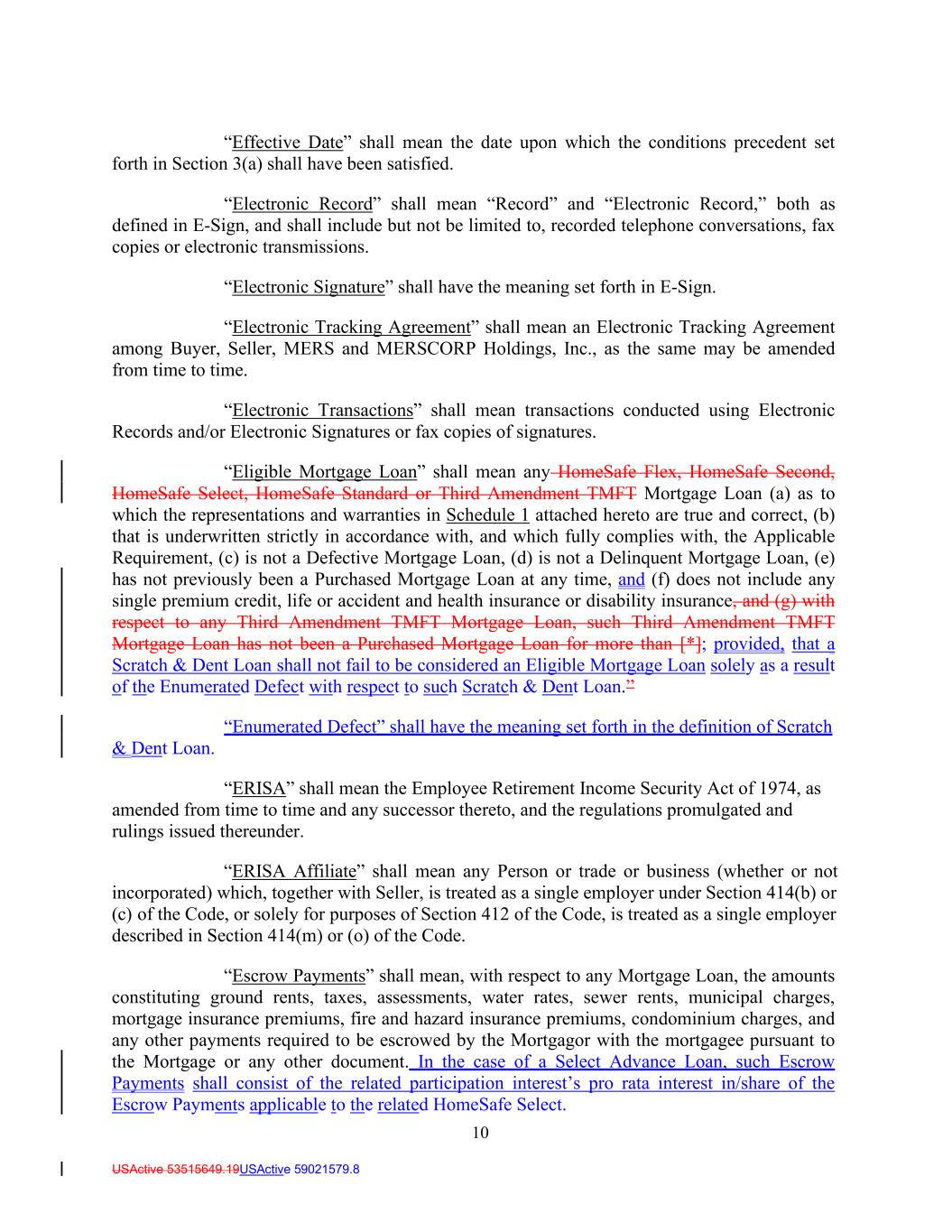 10 USActive 53515649.19USActive 59021579.8 “Effective Date” shall mean the date upon which the conditions precedent set forth in Section 3(a) shall have been satisfied. “Electronic Record” shall mean “Record” and “Electronic Record,” both as defined in E-Sign, and shall include but not be limited to, recorded telephone conversations, fax copies or electronic transmissions. “Electronic Signature” shall have the meaning set forth in E-Sign. “Electronic Tracking Agreement” shall mean an Electronic Tracking Agreement among Buyer, Seller, MERS and MERSCORP Holdings, Inc., as the same may be amended from time to time. “Electronic Transactions” shall mean transactions conducted using Electronic Records and/or Electronic Signatures or fax copies of signatures. “Eligible Mortgage Loan” shall mean any HomeSafe Flex, HomeSafe Second, HomeSafe Select, HomeSafe Standard or Third Amendment TMFT Mortgage Loan (a) as to which the representations and warranties in Schedule 1 attached hereto are true and correct, (b) that is underwritten strictly in accordance with, and which fully complies with, the Applicable Requirement, (c) is not a Defective Mortgage Loan, (d) is not a Delinquent Mortgage Loan, (e) has not previously been a Purchased Mortgage Loan at any time, and (f) does not include any single premium credit, life or accident and health insurance or disability insurance, and (g) with respect to any Third Amendment TMFT Mortgage Loan, such Third Amendment TMFT Mortgage Loan has not been a Purchased Mortgage Loan for more than [*]; provided, that a Scratch & Dent Loan shall not fail to be considered an Eligible Mortgage Loan solely as a result of the Enumerated Defect with respect to such Scratch & Dent Loan.” “Enumerated Defect” shall have the meaning set forth in the definition of Scratch & Dent Loan. “ERISA” shall mean the Employee Retirement Income Security Act of 1974, as amended from time to time and any successor thereto, and the regulations promulgated and rulings issued thereunder. “ERISA Affiliate” shall mean any Person or trade or business (whether or not incorporated) which, together with Seller, is treated as a single employer under Section 414(b) or (c) of the Code, or solely for purposes of Section 412 of the Code, is treated as a single employer described in Section 414(m) or (o) of the Code. “Escrow Payments” shall mean, with respect to any Mortgage Loan, the amounts constituting ground rents, taxes, assessments, water rates, sewer rents, municipal charges, mortgage insurance premiums, fire and hazard insurance premiums, condominium charges, and any other payments required to be escrowed by the Mortgagor with the mortgagee pursuant to the Mortgage or any other document. In the case of a Select Advance Loan, such Escrow Payments shall consist of the related participation interest’s pro rata interest in/share of the Escrow Payments applicable to the related HomeSafe Select.