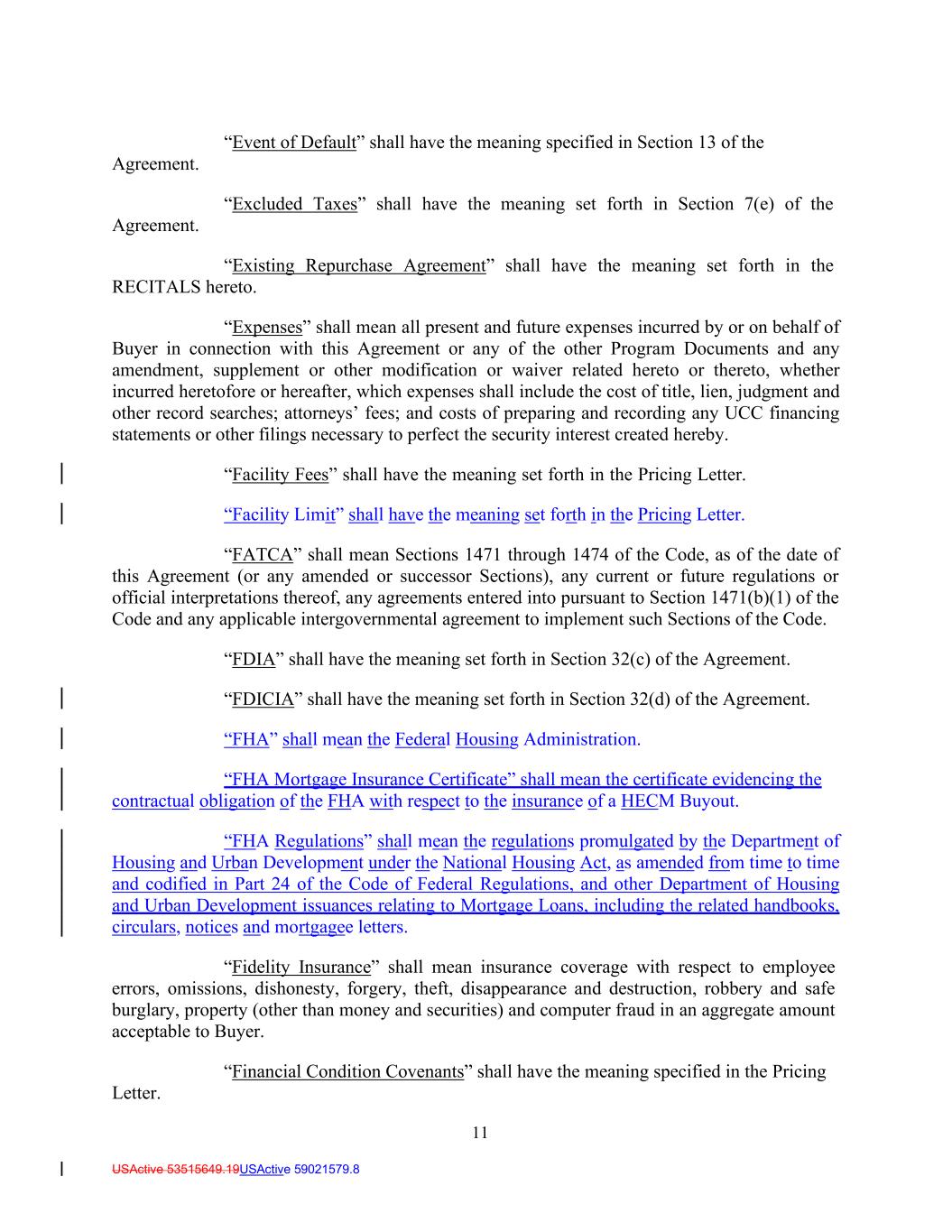 11 USActive 53515649.19USActive 59021579.8 Agreement. Agreement. “Event of Default” shall have the meaning specified in Section 13 of the “Excluded Taxes” shall have the meaning set forth in Section 7(e) of the “Existing Repurchase Agreement” shall have the meaning set forth in the RECITALS hereto. “Expenses” shall mean all present and future expenses incurred by or on behalf of Buyer in connection with this Agreement or any of the other Program Documents and any amendment, supplement or other modification or waiver related hereto or thereto, whether incurred heretofore or hereafter, which expenses shall include the cost of title, lien, judgment and other record searches; attorneys’ fees; and costs of preparing and recording any UCC financing statements or other filings necessary to perfect the security interest created hereby. “Facility Fees” shall have the meaning set forth in the Pricing Letter. “Facility Limit” shall have the meaning set forth in the Pricing Letter. “FATCA” shall mean Sections 1471 through 1474 of the Code, as of the date of this Agreement (or any amended or successor Sections), any current or future regulations or official interpretations thereof, any agreements entered into pursuant to Section 1471(b)(1) of the Code and any applicable intergovernmental agreement to implement such Sections of the Code. “FDIA” shall have the meaning set forth in Section 32(c) of the Agreement. “FDICIA” shall have the meaning set forth in Section 32(d) of the Agreement. “FHA” shall mean the Federal Housing Administration. “FHA Mortgage Insurance Certificate” shall mean the certificate evidencing the contractual obligation of the FHA with respect to the insurance of a HECM Buyout. “FHA Regulations” shall mean the regulations promulgated by the Department of Housing and Urban Development under the National Housing Act, as amended from time to time and codified in Part 24 of the Code of Federal Regulations, and other Department of Housing and Urban Development issuances relating to Mortgage Loans, including the related handbooks, circulars, notices and mortgagee letters. “Fidelity Insurance” shall mean insurance coverage with respect to employee errors, omissions, dishonesty, forgery, theft, disappearance and destruction, robbery and safe burglary, property (other than money and securities) and computer fraud in an aggregate amount acceptable to Buyer. “Financial Condition Covenants” shall have the meaning specified in the Pricing Letter.