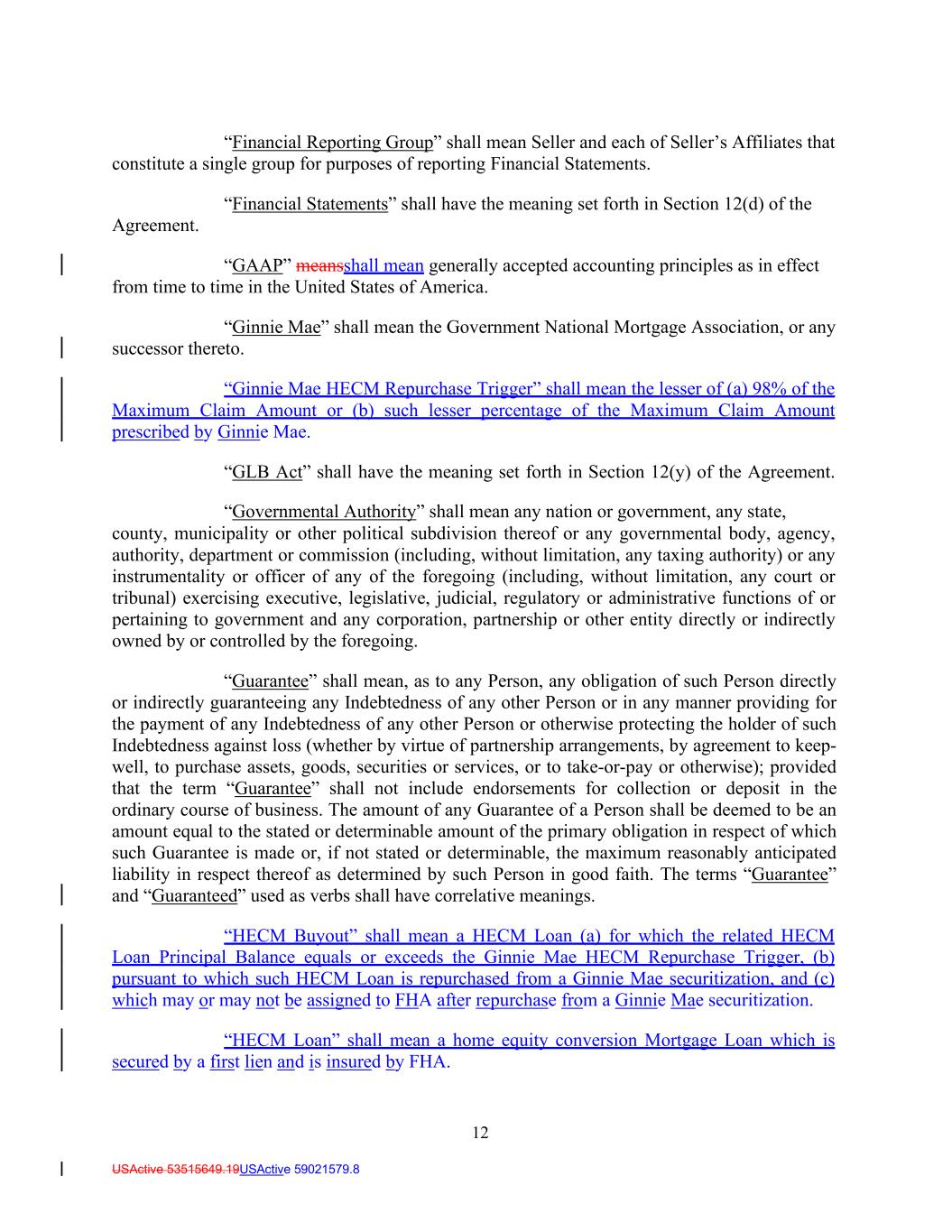 12 USActive 53515649.19USActive 59021579.8 “Financial Reporting Group” shall mean Seller and each of Seller’s Affiliates that constitute a single group for purposes of reporting Financial Statements. “Financial Statements” shall have the meaning set forth in Section 12(d) of the Agreement. “GAAP” meansshall mean generally accepted accounting principles as in effect from time to time in the United States of America. “Ginnie Mae” shall mean the Government National Mortgage Association, or any successor thereto. “Ginnie Mae HECM Repurchase Trigger” shall mean the lesser of (a) 98% of the Maximum Claim Amount or (b) such lesser percentage of the Maximum Claim Amount prescribed by Ginnie Mae. “GLB Act” shall have the meaning set forth in Section 12(y) of the Agreement. “Governmental Authority” shall mean any nation or government, any state, county, municipality or other political subdivision thereof or any governmental body, agency, authority, department or commission (including, without limitation, any taxing authority) or any instrumentality or officer of any of the foregoing (including, without limitation, any court or tribunal) exercising executive, legislative, judicial, regulatory or administrative functions of or pertaining to government and any corporation, partnership or other entity directly or indirectly owned by or controlled by the foregoing. “Guarantee” shall mean, as to any Person, any obligation of such Person directly or indirectly guaranteeing any Indebtedness of any other Person or in any manner providing for the payment of any Indebtedness of any other Person or otherwise protecting the holder of such Indebtedness against loss (whether by virtue of partnership arrangements, by agreement to keep- well, to purchase assets, goods, securities or services, or to take-or-pay or otherwise); provided that the term “Guarantee” shall not include endorsements for collection or deposit in the ordinary course of business. The amount of any Guarantee of a Person shall be deemed to be an amount equal to the stated or determinable amount of the primary obligation in respect of which such Guarantee is made or, if not stated or determinable, the maximum reasonably anticipated liability in respect thereof as determined by such Person in good faith. The terms “Guarantee” and “Guaranteed” used as verbs shall have correlative meanings. “HECM Buyout” shall mean a HECM Loan (a) for which the related HECM Loan Principal Balance equals or exceeds the Ginnie Mae HECM Repurchase Trigger, (b) pursuant to which such HECM Loan is repurchased from a Ginnie Mae securitization, and (c) which may or may not be assigned to FHA after repurchase from a Ginnie Mae securitization. “HECM Loan” shall mean a home equity conversion Mortgage Loan which is secured by a first lien and is insured by FHA.