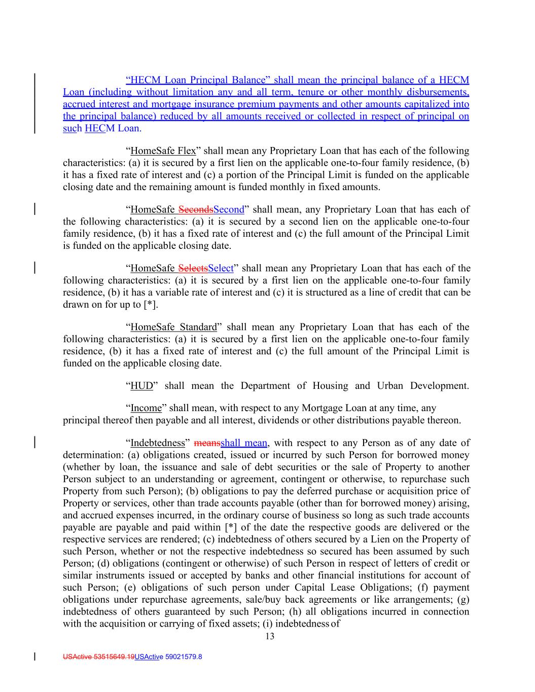 13 USActive 53515649.19USActive 59021579.8 “HECM Loan Principal Balance” shall mean the principal balance of a HECM Loan (including without limitation any and all term, tenure or other monthly disbursements, accrued interest and mortgage insurance premium payments and other amounts capitalized into the principal balance) reduced by all amounts received or collected in respect of principal on such HECM Loan. “HomeSafe Flex” shall mean any Proprietary Loan that has each of the following characteristics: (a) it is secured by a first lien on the applicable one-to-four family residence, (b) it has a fixed rate of interest and (c) a portion of the Principal Limit is funded on the applicable closing date and the remaining amount is funded monthly in fixed amounts. “HomeSafe SecondsSecond” shall mean, any Proprietary Loan that has each of the following characteristics: (a) it is secured by a second lien on the applicable one-to-four family residence, (b) it has a fixed rate of interest and (c) the full amount of the Principal Limit is funded on the applicable closing date. “HomeSafe SelectsSelect” shall mean any Proprietary Loan that has each of the following characteristics: (a) it is secured by a first lien on the applicable one-to-four family residence, (b) it has a variable rate of interest and (c) it is structured as a line of credit that can be drawn on for up to [*]. “HomeSafe Standard” shall mean any Proprietary Loan that has each of the following characteristics: (a) it is secured by a first lien on the applicable one-to-four family residence, (b) it has a fixed rate of interest and (c) the full amount of the Principal Limit is funded on the applicable closing date. “HUD” shall mean the Department of Housing and Urban Development. “Income” shall mean, with respect to any Mortgage Loan at any time, any principal thereof then payable and all interest, dividends or other distributions payable thereon. “Indebtedness” meansshall mean, with respect to any Person as of any date of determination: (a) obligations created, issued or incurred by such Person for borrowed money (whether by loan, the issuance and sale of debt securities or the sale of Property to another Person subject to an understanding or agreement, contingent or otherwise, to repurchase such Property from such Person); (b) obligations to pay the deferred purchase or acquisition price of Property or services, other than trade accounts payable (other than for borrowed money) arising, and accrued expenses incurred, in the ordinary course of business so long as such trade accounts payable are payable and paid within [*] of the date the respective goods are delivered or the respective services are rendered; (c) indebtedness of others secured by a Lien on the Property of such Person, whether or not the respective indebtedness so secured has been assumed by such Person; (d) obligations (contingent or otherwise) of such Person in respect of letters of credit or similar instruments issued or accepted by banks and other financial institutions for account of such Person; (e) obligations of such person under Capital Lease Obligations; (f) payment obligations under repurchase agreements, sale/buy back agreements or like arrangements; (g) indebtedness of others guaranteed by such Person; (h) all obligations incurred in connection with the acquisition or carrying of fixed assets; (i) indebtedness of
