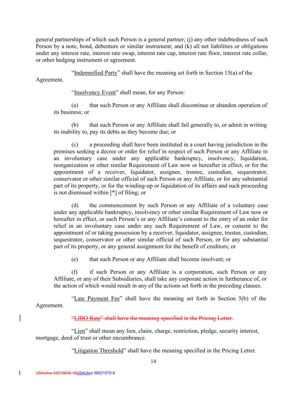 14 USActive 53515649.19USActive 59021579.8 general partnerships of which such Person is a general partner; (j) any other indebtedness of such Person by a note, bond, debenture or similar instrument; and (k) all net liabilities or obligations under any interest rate, interest rate swap, interest rate cap, interest rate floor, interest rate collar, or other hedging instrument or agreement. “Indemnified Party” shall have the meaning set forth in Section 15(a) of the Agreement. “Insolvency Event” shall mean, for any Person: (a) that such Person or any Affiliate shall discontinue or abandon operation of its business; or (b) that such Person or any Affiliate shall fail generally to, or admit in writing its inability to, pay its debts as they become due; or (c) a proceeding shall have been instituted in a court having jurisdiction in the premises seeking a decree or order for relief in respect of such Person or any Affiliate in an involuntary case under any applicable bankruptcy, insolvency, liquidation, reorganization or other similar Requirement of Law now or hereafter in effect, or for the appointment of a receiver, liquidator, assignee, trustee, custodian, sequestrator, conservator or other similar official of such Person or any Affiliate, or for any substantial part of its property, or for the winding-up or liquidation of its affairs and such proceeding is not dismissed within [*] of filing; or (d) the commencement by such Person or any Affiliate of a voluntary case under any applicable bankruptcy, insolvency or other similar Requirement of Law now or hereafter in effect, or such Person’s or any Affiliate’s consent to the entry of an order for relief in an involuntary case under any such Requirement of Law, or consent to the appointment of or taking possession by a receiver, liquidator, assignee, trustee, custodian, sequestrator, conservator or other similar official of such Person, or for any substantial part of its property, or any general assignment for the benefit of creditors; or (e) that such Person or any Affiliate shall become insolvent; or (f) if such Person or any Affiliate is a corporation, such Person or any Affiliate, or any of their Subsidiaries, shall take any corporate action in furtherance of, or the action of which would result in any of the actions set forth in the preceding clauses. “Late Payment Fee” shall have the meaning set forth in Section 5(b) of the Agreement. “LIBO Rate” shall have the meaning specified in the Pricing Letter. “Lien” shall mean any lien, claim, charge, restriction, pledge, security interest, mortgage, deed of trust or other encumbrance. “Litigation Threshold” shall have the meaning specified in the Pricing Letter.