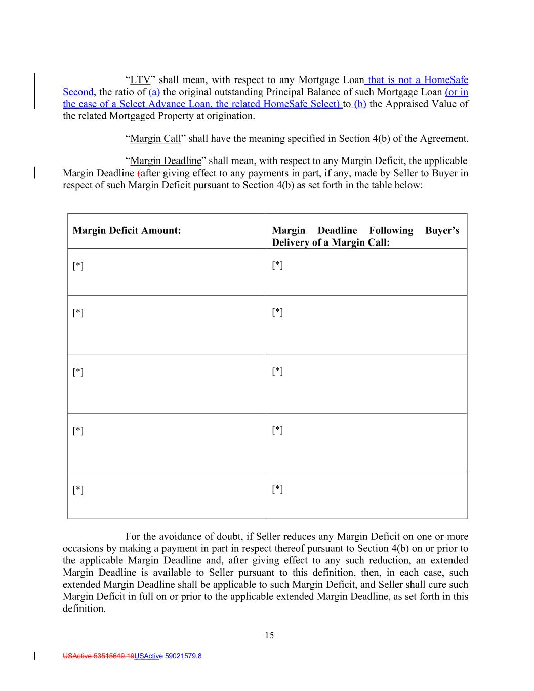 15 USActive 53515649.19USActive 59021579.8 “LTV” shall mean, with respect to any Mortgage Loan that is not a HomeSafe Second, the ratio of (a) the original outstanding Principal Balance of such Mortgage Loan (or in the case of a Select Advance Loan, the related HomeSafe Select) to (b) the Appraised Value of the related Mortgaged Property at origination. “Margin Call” shall have the meaning specified in Section 4(b) of the Agreement. “Margin Deadline” shall mean, with respect to any Margin Deficit, the applicable Margin Deadline (after giving effect to any payments in part, if any, made by Seller to Buyer in respect of such Margin Deficit pursuant to Section 4(b) as set forth in the table below: Margin Deficit Amount: Margin Deadline Following Buyer’s Delivery of a Margin Call: [*] [*] [*] [*] [*] [*] [*] [*] [*] [*] For the avoidance of doubt, if Seller reduces any Margin Deficit on one or more occasions by making a payment in part in respect thereof pursuant to Section 4(b) on or prior to the applicable Margin Deadline and, after giving effect to any such reduction, an extended Margin Deadline is available to Seller pursuant to this definition, then, in each case, such extended Margin Deadline shall be applicable to such Margin Deficit, and Seller shall cure such Margin Deficit in full on or prior to the applicable extended Margin Deadline, as set forth in this definition.