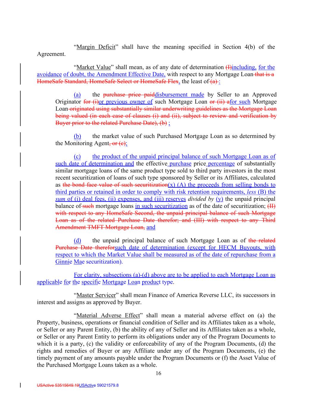 16 USActive 53515649.19USActive 59021579.8 Agreement. “Margin Deficit” shall have the meaning specified in Section 4(b) of the “Market Value” shall mean, as of any date of determination (I)including, for the avoidance of doubt, the Amendment Effective Date, with respect to any Mortgage Loan that is a HomeSafe Standard, HomeSafe Select or HomeSafe Flex, the least of (a) : (a) the purchase price paiddisbursement made by Seller to an Approved Originator for (i)or previous owner of such Mortgage Loan or (ii) afor such Mortgage Loan originated using substantially similar underwriting guidelines as the Mortgage Loan being valued (in each case of clauses (i) and (ii), subject to review and verification by Buyer prior to the related Purchase Date), (b) ; (b) the market value of such Purchased Mortgage Loan as so determined by the Monitoring Agent, or (c); (c) the product of the unpaid principal balance of such Mortgage Loan as of such date of determination and the effective purchase price percentage of substantially similar mortgage loans of the same product type sold to third party investors in the most recent securitization of loans of such type sponsored by Seller or its Affiliates, calculated as the bond face value of such securitization(x) (A) the proceeds from selling bonds to third parties or retained in order to comply with risk retention requirements, less (B) the sum of (i) deal fees, (ii) expenses, and (iii) reserves divided by (y) the unpaid principal balance of such mortgage loans in such securitization as of the date of securitization; (II) with respect to any HomeSafe Second, the unpaid principal balance of such Mortgage Loan as of the related Purchase Date therefor; and (III) with respect to any Third Amendment TMFT Mortgage Loan, and (d) the unpaid principal balance of such Mortgage Loan as of the related Purchase Date thereforsuch date of determination (except for HECM Buyouts, with respect to which the Market Value shall be measured as of the date of repurchase from a Ginnie Mae securitization). For clarity, subsections (a)-(d) above are to be applied to each Mortgage Loan as applicable for the specific Mortgage Loan product type. “Master Servicer” shall mean Finance of America Reverse LLC, its successors in interest and assigns as approved by Buyer. “Material Adverse Effect” shall mean a material adverse effect on (a) the Property, business, operations or financial condition of Seller and its Affiliates taken as a whole, or Seller or any Parent Entity, (b) the ability of any of Seller and its Affiliates taken as a whole, or Seller or any Parent Entity to perform its obligations under any of the Program Documents to which it is a party, (c) the validity or enforceability of any of the Program Documents, (d) the rights and remedies of Buyer or any Affiliate under any of the Program Documents, (e) the timely payment of any amounts payable under the Program Documents or (f) the Asset Value of the Purchased Mortgage Loans taken as a whole.