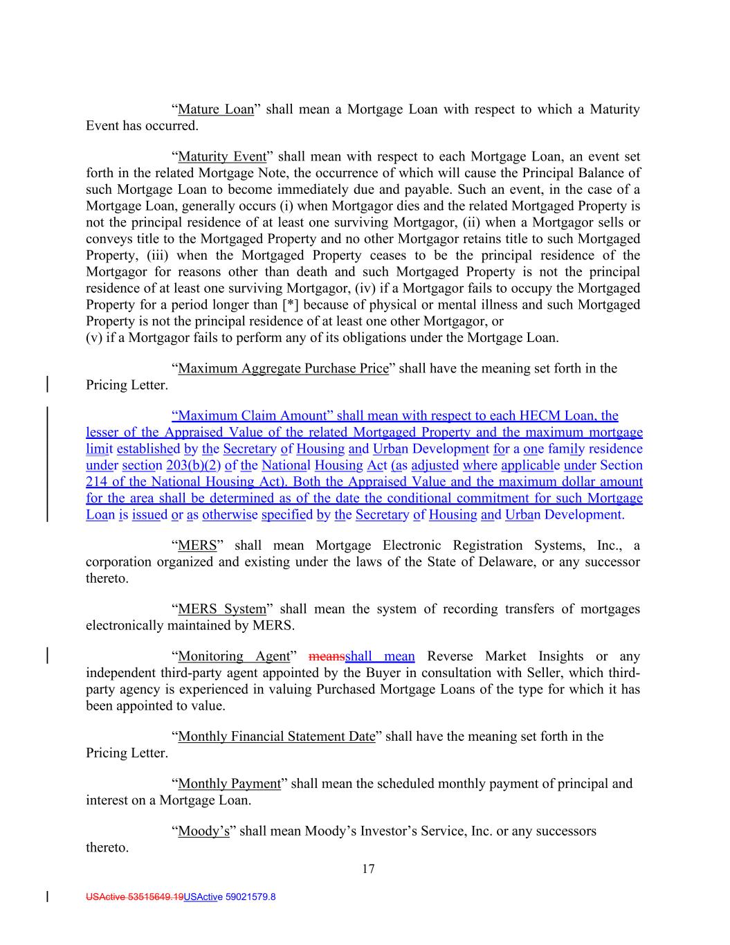 17 USActive 53515649.19USActive 59021579.8 “Mature Loan” shall mean a Mortgage Loan with respect to which a Maturity Event has occurred. “Maturity Event” shall mean with respect to each Mortgage Loan, an event set forth in the related Mortgage Note, the occurrence of which will cause the Principal Balance of such Mortgage Loan to become immediately due and payable. Such an event, in the case of a Mortgage Loan, generally occurs (i) when Mortgagor dies and the related Mortgaged Property is not the principal residence of at least one surviving Mortgagor, (ii) when a Mortgagor sells or conveys title to the Mortgaged Property and no other Mortgagor retains title to such Mortgaged Property, (iii) when the Mortgaged Property ceases to be the principal residence of the Mortgagor for reasons other than death and such Mortgaged Property is not the principal residence of at least one surviving Mortgagor, (iv) if a Mortgagor fails to occupy the Mortgaged Property for a period longer than [*] because of physical or mental illness and such Mortgaged Property is not the principal residence of at least one other Mortgagor, or (v) if a Mortgagor fails to perform any of its obligations under the Mortgage Loan. “Maximum Aggregate Purchase Price” shall have the meaning set forth in the Pricing Letter. “Maximum Claim Amount” shall mean with respect to each HECM Loan, the lesser of the Appraised Value of the related Mortgaged Property and the maximum mortgage limit established by the Secretary of Housing and Urban Development for a one family residence under section 203(b)(2) of the National Housing Act (as adjusted where applicable under Section 214 of the National Housing Act). Both the Appraised Value and the maximum dollar amount for the area shall be determined as of the date the conditional commitment for such Mortgage Loan is issued or as otherwise specified by the Secretary of Housing and Urban Development. “MERS” shall mean Mortgage Electronic Registration Systems, Inc., a corporation organized and existing under the laws of the State of Delaware, or any successor thereto. “MERS System” shall mean the system of recording transfers of mortgages electronically maintained by MERS. “Monitoring Agent” meansshall mean Reverse Market Insights or any independent third-party agent appointed by the Buyer in consultation with Seller, which third- party agency is experienced in valuing Purchased Mortgage Loans of the type for which it has been appointed to value. “Monthly Financial Statement Date” shall have the meaning set forth in the Pricing Letter. “Monthly Payment” shall mean the scheduled monthly payment of principal and interest on a Mortgage Loan. “Moody’s” shall mean Moody’s Investor’s Service, Inc. or any successors thereto.