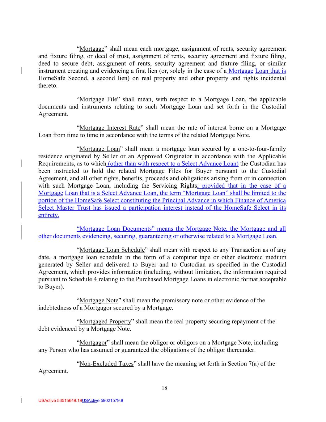 18 USActive 53515649.19USActive 59021579.8 “Mortgage” shall mean each mortgage, assignment of rents, security agreement and fixture filing, or deed of trust, assignment of rents, security agreement and fixture filing, deed to secure debt, assignment of rents, security agreement and fixture filing, or similar instrument creating and evidencing a first lien (or, solely in the case of a Mortgage Loan that is HomeSafe Second, a second lien) on real property and other property and rights incidental thereto. “Mortgage File” shall mean, with respect to a Mortgage Loan, the applicable documents and instruments relating to such Mortgage Loan and set forth in the Custodial Agreement. “Mortgage Interest Rate” shall mean the rate of interest borne on a Mortgage Loan from time to time in accordance with the terms of the related Mortgage Note. “Mortgage Loan” shall mean a mortgage loan secured by a one-to-four-family residence originated by Seller or an Approved Originator in accordance with the Applicable Requirements, as to which (other than with respect to a Select Advance Loan) the Custodian has been instructed to hold the related Mortgage Files for Buyer pursuant to the Custodial Agreement, and all other rights, benefits, proceeds and obligations arising from or in connection with such Mortgage Loan, including the Servicing Rights; provided that in the case of a Mortgage Loan that is a Select Advance Loan, the term “Mortgage Loan” shall be limited to the portion of the HomeSafe Select constituting the Principal Advance in which Finance of America Select Master Trust has issued a participation interest instead of the HomeSafe Select in its entirety. “Mortgage Loan Documents” means the Mortgage Note, the Mortgage and all other documents evidencing, securing, guaranteeing or otherwise related to a Mortgage Loan. “Mortgage Loan Schedule” shall mean with respect to any Transaction as of any date, a mortgage loan schedule in the form of a computer tape or other electronic medium generated by Seller and delivered to Buyer and to Custodian as specified in the Custodial Agreement, which provides information (including, without limitation, the information required pursuant to Schedule 4 relating to the Purchased Mortgage Loans in electronic format acceptable to Buyer). “Mortgage Note” shall mean the promissory note or other evidence of the indebtedness of a Mortgagor secured by a Mortgage. “Mortgaged Property” shall mean the real property securing repayment of the debt evidenced by a Mortgage Note. “Mortgagor” shall mean the obligor or obligors on a Mortgage Note, including any Person who has assumed or guaranteed the obligations of the obligor thereunder. “Non-Excluded Taxes” shall have the meaning set forth in Section 7(a) of the Agreement.