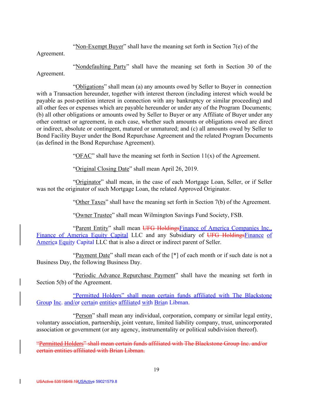 19 USActive 53515649.19USActive 59021579.8 Agreement. Agreement. “Non-Exempt Buyer” shall have the meaning set forth in Section 7(e) of the “Nondefaulting Party” shall have the meaning set forth in Section 30 of the “Obligations” shall mean (a) any amounts owed by Seller to Buyer in connection with a Transaction hereunder, together with interest thereon (including interest which would be payable as post-petition interest in connection with any bankruptcy or similar proceeding) and all other fees or expenses which are payable hereunder or under any of the Program Documents; (b) all other obligations or amounts owed by Seller to Buyer or any Affiliate of Buyer under any other contract or agreement, in each case, whether such amounts or obligations owed are direct or indirect, absolute or contingent, matured or unmatured; and (c) all amounts owed by Seller to Bond Facility Buyer under the Bond Repurchase Agreement and the related Program Documents (as defined in the Bond Repurchase Agreement). “OFAC” shall have the meaning set forth in Section 11(x) of the Agreement. “Original Closing Date” shall mean April 26, 2019. “Originator” shall mean, in the case of each Mortgage Loan, Seller, or if Seller was not the originator of such Mortgage Loan, the related Approved Originator. “Other Taxes” shall have the meaning set forth in Section 7(b) of the Agreement. “Owner Trustee” shall mean Wilmington Savings Fund Society, FSB. “Parent Entity” shall mean UFG HoldingsFinance of America Companies Inc., Finance of America Equity Capital LLC and any Subsidiary of UFG HoldingsFinance of America Equity Capital LLC that is also a direct or indirect parent of Seller. “Payment Date” shall mean each of the [*] of each month or if such date is not a Business Day, the following Business Day. “Periodic Advance Repurchase Payment” shall have the meaning set forth in Section 5(b) of the Agreement. “Permitted Holders” shall mean certain funds affiliated with The Blackstone Group Inc. and/or certain entities affiliated with Brian Libman. “Person” shall mean any individual, corporation, company or similar legal entity, voluntary association, partnership, joint venture, limited liability company, trust, unincorporated association or government (or any agency, instrumentality or political subdivision thereof). “Permitted Holders” shall mean certain funds affiliated with The Blackstone Group Inc. and/or certain entities affiliated with Brian Libman.