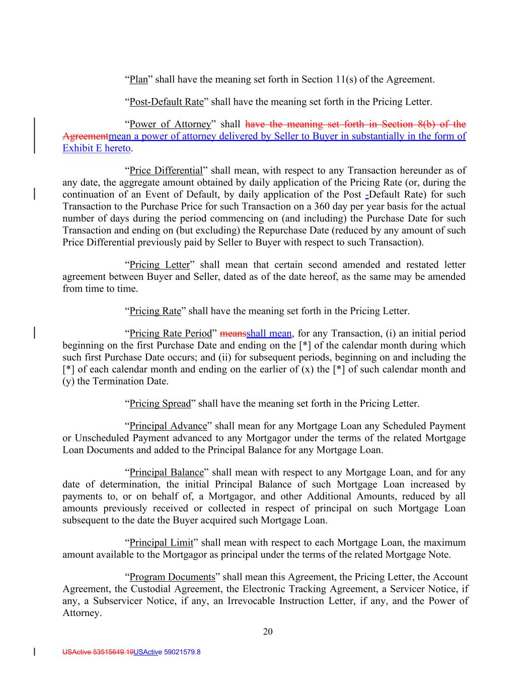 20 USActive 53515649.19USActive 59021579.8 “Plan” shall have the meaning set forth in Section 11(s) of the Agreement. “Post-Default Rate” shall have the meaning set forth in the Pricing Letter. “Power of Attorney” shall have the meaning set forth in Section 8(b) of the Agreementmean a power of attorney delivered by Seller to Buyer in substantially in the form of Exhibit E hereto. “Price Differential” shall mean, with respect to any Transaction hereunder as of any date, the aggregate amount obtained by daily application of the Pricing Rate (or, during the continuation of an Event of Default, by daily application of the Post -Default Rate) for such Transaction to the Purchase Price for such Transaction on a 360 day per year basis for the actual number of days during the period commencing on (and including) the Purchase Date for such Transaction and ending on (but excluding) the Repurchase Date (reduced by any amount of such Price Differential previously paid by Seller to Buyer with respect to such Transaction). “Pricing Letter” shall mean that certain second amended and restated letter agreement between Buyer and Seller, dated as of the date hereof, as the same may be amended from time to time. “Pricing Rate” shall have the meaning set forth in the Pricing Letter. “Pricing Rate Period” meansshall mean, for any Transaction, (i) an initial period beginning on the first Purchase Date and ending on the [*] of the calendar month during which such first Purchase Date occurs; and (ii) for subsequent periods, beginning on and including the [*] of each calendar month and ending on the earlier of (x) the [*] of such calendar month and (y) the Termination Date. “Pricing Spread” shall have the meaning set forth in the Pricing Letter. “Principal Advance” shall mean for any Mortgage Loan any Scheduled Payment or Unscheduled Payment advanced to any Mortgagor under the terms of the related Mortgage Loan Documents and added to the Principal Balance for any Mortgage Loan. “Principal Balance” shall mean with respect to any Mortgage Loan, and for any date of determination, the initial Principal Balance of such Mortgage Loan increased by payments to, or on behalf of, a Mortgagor, and other Additional Amounts, reduced by all amounts previously received or collected in respect of principal on such Mortgage Loan subsequent to the date the Buyer acquired such Mortgage Loan. “Principal Limit” shall mean with respect to each Mortgage Loan, the maximum amount available to the Mortgagor as principal under the terms of the related Mortgage Note. “Program Documents” shall mean this Agreement, the Pricing Letter, the Account Agreement, the Custodial Agreement, the Electronic Tracking Agreement, a Servicer Notice, if any, a Subservicer Notice, if any, an Irrevocable Instruction Letter, if any, and the Power of Attorney.
