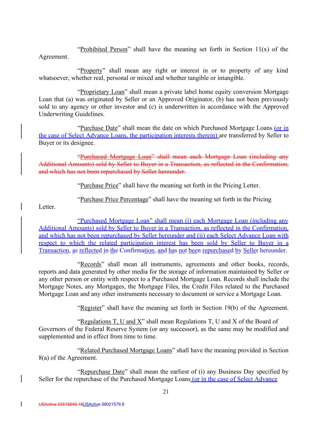 21 USActive 53515649.19USActive 59021579.8 Agreement. “Prohibited Person” shall have the meaning set forth in Section 11(x) of the “Property” shall mean any right or interest in or to property of any kind whatsoever, whether real, personal or mixed and whether tangible or intangible. “Proprietary Loan” shall mean a private label home equity conversion Mortgage Loan that (a) was originated by Seller or an Approved Originator, (b) has not been previously sold to any agency or other investor and (c) is underwritten in accordance with the Approved Underwriting Guidelines. “Purchase Date” shall mean the date on which Purchased Mortgage Loans (or in the case of Select Advance Loans, the participation interests therein) are transferred by Seller to Buyer or its designee. “Purchased Mortgage Loan” shall mean each Mortgage Loan (including any Additional Amounts) sold by Seller to Buyer in a Transaction, as reflected in the Confirmation, and which has not been repurchased by Seller hereunder. “Purchase Price” shall have the meaning set forth in the Pricing Letter. “Purchase Price Percentage” shall have the meaning set forth in the Pricing Letter. “Purchased Mortgage Loan” shall mean (i) each Mortgage Loan (including any Additional Amounts) sold by Seller to Buyer in a Transaction, as reflected in the Confirmation, and which has not been repurchased by Seller hereunder and (ii) each Select Advance Loan with respect to which the related participation interest has been sold by Seller to Buyer in a Transaction, as reflected in the Confirmation, and has not been repurchased by Seller hereunder. “Records” shall mean all instruments, agreements and other books, records, reports and data generated by other media for the storage of information maintained by Seller or any other person or entity with respect to a Purchased Mortgage Loan. Records shall include the Mortgage Notes, any Mortgages, the Mortgage Files, the Credit Files related to the Purchased Mortgage Loan and any other instruments necessary to document or service a Mortgage Loan. “Register” shall have the meaning set forth in Section 19(b) of the Agreement. “Regulations T, U and X” shall mean Regulations T, U and X of the Board of Governors of the Federal Reserve System (or any successor), as the same may be modified and supplemented and in effect from time to time. “Related Purchased Mortgage Loans” shall have the meaning provided in Section 8(a) of the Agreement. “Repurchase Date” shall mean the earliest of (i) any Business Day specified by Seller for the repurchase of the Purchased Mortgage Loans (or in the case of Select Advance