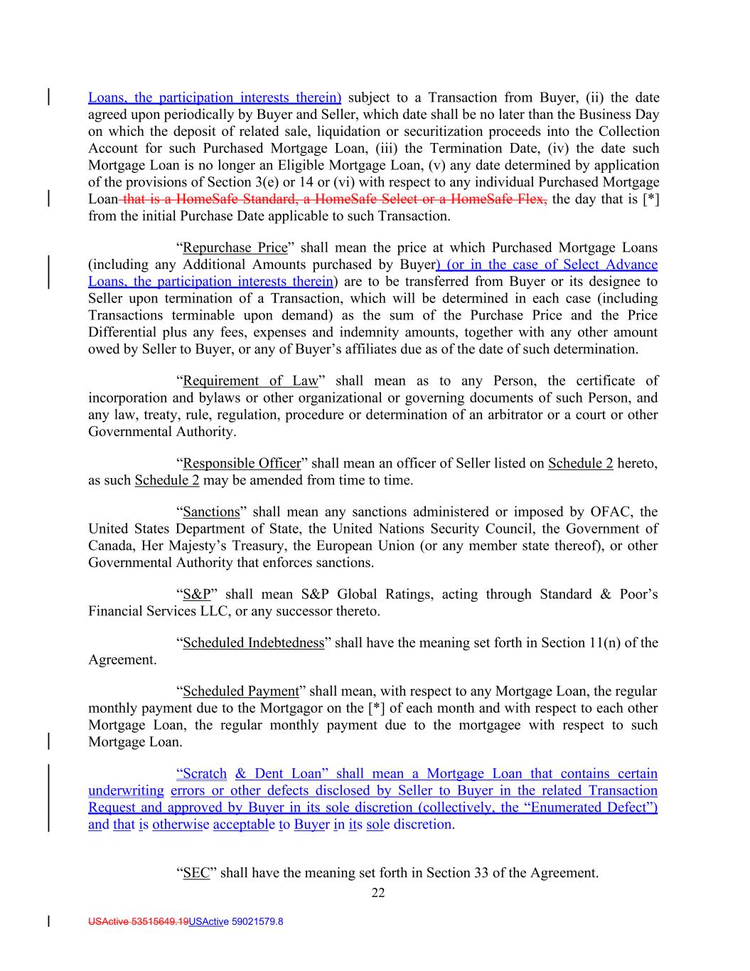 22 USActive 53515649.19USActive 59021579.8 Loans, the participation interests therein) subject to a Transaction from Buyer, (ii) the date agreed upon periodically by Buyer and Seller, which date shall be no later than the Business Day on which the deposit of related sale, liquidation or securitization proceeds into the Collection Account for such Purchased Mortgage Loan, (iii) the Termination Date, (iv) the date such Mortgage Loan is no longer an Eligible Mortgage Loan, (v) any date determined by application of the provisions of Section 3(e) or 14 or (vi) with respect to any individual Purchased Mortgage Loan that is a HomeSafe Standard, a HomeSafe Select or a HomeSafe Flex, the day that is [*] from the initial Purchase Date applicable to such Transaction. “Repurchase Price” shall mean the price at which Purchased Mortgage Loans (including any Additional Amounts purchased by Buyer) (or in the case of Select Advance Loans, the participation interests therein) are to be transferred from Buyer or its designee to Seller upon termination of a Transaction, which will be determined in each case (including Transactions terminable upon demand) as the sum of the Purchase Price and the Price Differential plus any fees, expenses and indemnity amounts, together with any other amount owed by Seller to Buyer, or any of Buyer’s affiliates due as of the date of such determination. “Requirement of Law” shall mean as to any Person, the certificate of incorporation and bylaws or other organizational or governing documents of such Person, and any law, treaty, rule, regulation, procedure or determination of an arbitrator or a court or other Governmental Authority. “Responsible Officer” shall mean an officer of Seller listed on Schedule 2 hereto, as such Schedule 2 may be amended from time to time. “Sanctions” shall mean any sanctions administered or imposed by OFAC, the United States Department of State, the United Nations Security Council, the Government of Canada, Her Majesty’s Treasury, the European Union (or any member state thereof), or other Governmental Authority that enforces sanctions. “S&P” shall mean S&P Global Ratings, acting through Standard & Poor’s Financial Services LLC, or any successor thereto. “Scheduled Indebtedness” shall have the meaning set forth in Section 11(n) of the Agreement. “Scheduled Payment” shall mean, with respect to any Mortgage Loan, the regular monthly payment due to the Mortgagor on the [*] of each month and with respect to each other Mortgage Loan, the regular monthly payment due to the mortgagee with respect to such Mortgage Loan. “Scratch & Dent Loan” shall mean a Mortgage Loan that contains certain underwriting errors or other defects disclosed by Seller to Buyer in the related Transaction Request and approved by Buyer in its sole discretion (collectively, the “Enumerated Defect”) and that is otherwise acceptable to Buyer in its sole discretion. “SEC” shall have the meaning set forth in Section 33 of the Agreement.