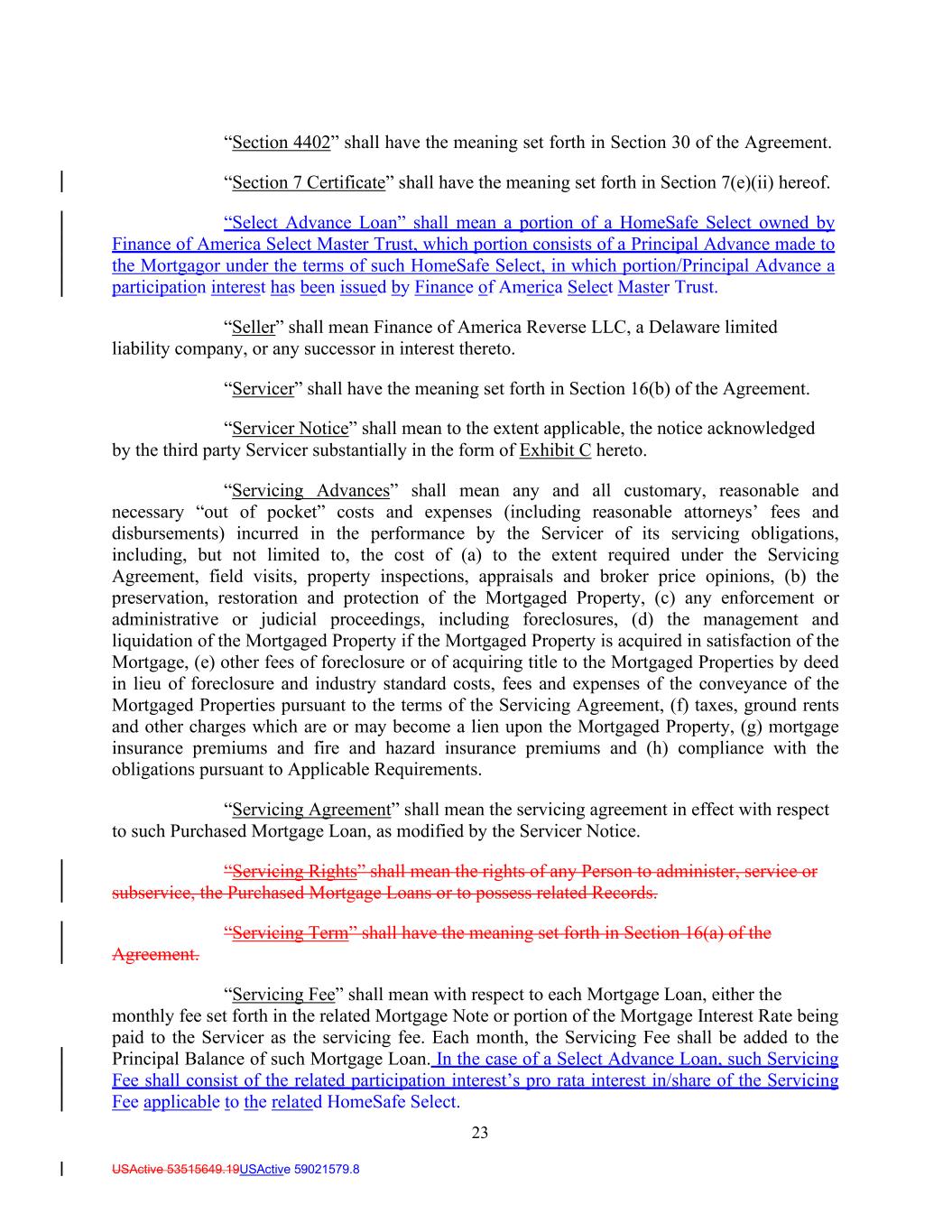23 USActive 53515649.19USActive 59021579.8 “Section 4402” shall have the meaning set forth in Section 30 of the Agreement. “Section 7 Certificate” shall have the meaning set forth in Section 7(e)(ii) hereof. “Select Advance Loan” shall mean a portion of a HomeSafe Select owned by Finance of America Select Master Trust, which portion consists of a Principal Advance made to the Mortgagor under the terms of such HomeSafe Select, in which portion/Principal Advance a participation interest has been issued by Finance of America Select Master Trust. “Seller” shall mean Finance of America Reverse LLC, a Delaware limited liability company, or any successor in interest thereto. “Servicer” shall have the meaning set forth in Section 16(b) of the Agreement. “Servicer Notice” shall mean to the extent applicable, the notice acknowledged by the third party Servicer substantially in the form of Exhibit C hereto. “Servicing Advances” shall mean any and all customary, reasonable and necessary “out of pocket” costs and expenses (including reasonable attorneys’ fees and disbursements) incurred in the performance by the Servicer of its servicing obligations, including, but not limited to, the cost of (a) to the extent required under the Servicing Agreement, field visits, property inspections, appraisals and broker price opinions, (b) the preservation, restoration and protection of the Mortgaged Property, (c) any enforcement or administrative or judicial proceedings, including foreclosures, (d) the management and liquidation of the Mortgaged Property if the Mortgaged Property is acquired in satisfaction of the Mortgage, (e) other fees of foreclosure or of acquiring title to the Mortgaged Properties by deed in lieu of foreclosure and industry standard costs, fees and expenses of the conveyance of the Mortgaged Properties pursuant to the terms of the Servicing Agreement, (f) taxes, ground rents and other charges which are or may become a lien upon the Mortgaged Property, (g) mortgage insurance premiums and fire and hazard insurance premiums and (h) compliance with the obligations pursuant to Applicable Requirements. “Servicing Agreement” shall mean the servicing agreement in effect with respect to such Purchased Mortgage Loan, as modified by the Servicer Notice. “Servicing Rights” shall mean the rights of any Person to administer, service or subservice, the Purchased Mortgage Loans or to possess related Records. “Servicing Term” shall have the meaning set forth in Section 16(a) of the Agreement. “Servicing Fee” shall mean with respect to each Mortgage Loan, either the monthly fee set forth in the related Mortgage Note or portion of the Mortgage Interest Rate being paid to the Servicer as the servicing fee. Each month, the Servicing Fee shall be added to the Principal Balance of such Mortgage Loan. In the case of a Select Advance Loan, such Servicing Fee shall consist of the related participation interest’s pro rata interest in/share of the Servicing Fee applicable to the related HomeSafe Select.
