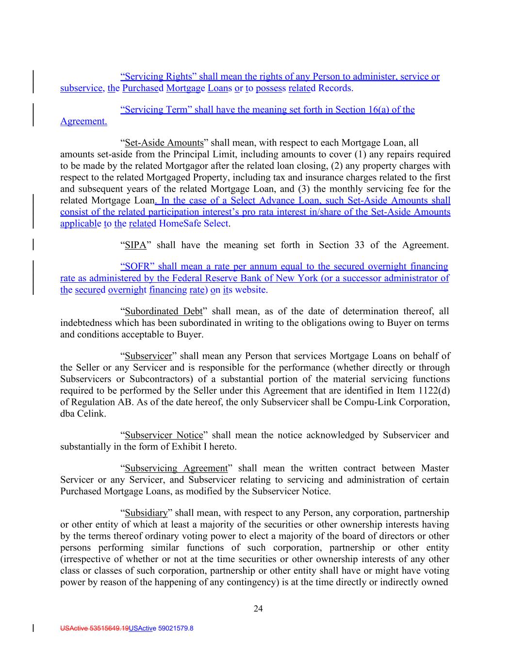24 USActive 53515649.19USActive 59021579.8 “Servicing Rights” shall mean the rights of any Person to administer, service or subservice, the Purchased Mortgage Loans or to possess related Records. “Servicing Term” shall have the meaning set forth in Section 16(a) of the Agreement. “Set-Aside Amounts” shall mean, with respect to each Mortgage Loan, all amounts set-aside from the Principal Limit, including amounts to cover (1) any repairs required to be made by the related Mortgagor after the related loan closing, (2) any property charges with respect to the related Mortgaged Property, including tax and insurance charges related to the first and subsequent years of the related Mortgage Loan, and (3) the monthly servicing fee for the related Mortgage Loan. In the case of a Select Advance Loan, such Set-Aside Amounts shall consist of the related participation interest’s pro rata interest in/share of the Set-Aside Amounts applicable to the related HomeSafe Select. “SIPA” shall have the meaning set forth in Section 33 of the Agreement. “SOFR” shall mean a rate per annum equal to the secured overnight financing rate as administered by the Federal Reserve Bank of New York (or a successor administrator of the secured overnight financing rate) on its website. “Subordinated Debt” shall mean, as of the date of determination thereof, all indebtedness which has been subordinated in writing to the obligations owing to Buyer on terms and conditions acceptable to Buyer. “Subservicer” shall mean any Person that services Mortgage Loans on behalf of the Seller or any Servicer and is responsible for the performance (whether directly or through Subservicers or Subcontractors) of a substantial portion of the material servicing functions required to be performed by the Seller under this Agreement that are identified in Item 1122(d) of Regulation AB. As of the date hereof, the only Subservicer shall be Compu-Link Corporation, dba Celink. “Subservicer Notice” shall mean the notice acknowledged by Subservicer and substantially in the form of Exhibit I hereto. “Subservicing Agreement” shall mean the written contract between Master Servicer or any Servicer, and Subservicer relating to servicing and administration of certain Purchased Mortgage Loans, as modified by the Subservicer Notice. “Subsidiary” shall mean, with respect to any Person, any corporation, partnership or other entity of which at least a majority of the securities or other ownership interests having by the terms thereof ordinary voting power to elect a majority of the board of directors or other persons performing similar functions of such corporation, partnership or other entity (irrespective of whether or not at the time securities or other ownership interests of any other class or classes of such corporation, partnership or other entity shall have or might have voting power by reason of the happening of any contingency) is at the time directly or indirectly owned