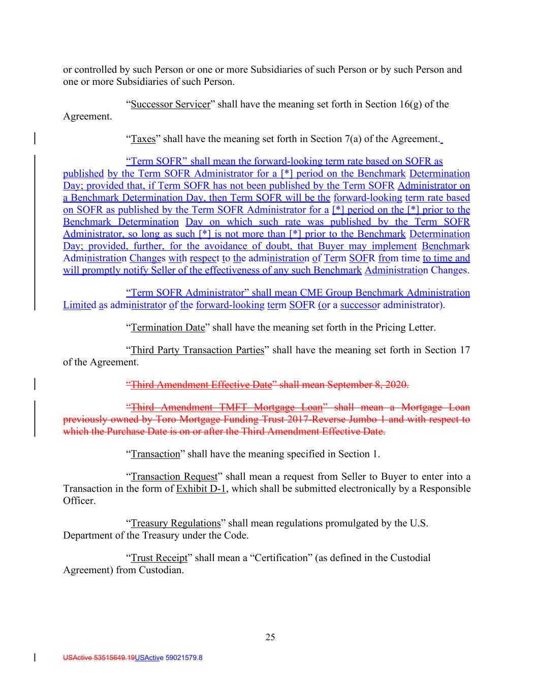 25 USActive 53515649.19USActive 59021579.8 or controlled by such Person or one or more Subsidiaries of such Person or by such Person and one or more Subsidiaries of such Person. “Successor Servicer” shall have the meaning set forth in Section 16(g) of the Agreement. “Taxes” shall have the meaning set forth in Section 7(a) of the Agreement. “Term SOFR” shall mean the forward-looking term rate based on SOFR as published by the Term SOFR Administrator for a [*] period on the Benchmark Determination Day; provided that, if Term SOFR has not been published by the Term SOFR Administrator on a Benchmark Determination Day, then Term SOFR will be the forward-looking term rate based on SOFR as published by the Term SOFR Administrator for a [*] period on the [*] prior to the Benchmark Determination Day on which such rate was published by the Term SOFR Administrator, so long as such [*] is not more than [*] prior to the Benchmark Determination Day; provided, further, for the avoidance of doubt, that Buyer may implement Benchmark Administration Changes with respect to the administration of Term SOFR from time to time and will promptly notify Seller of the effectiveness of any such Benchmark Administration Changes. “Term SOFR Administrator” shall mean CME Group Benchmark Administration Limited as administrator of the forward-looking term SOFR (or a successor administrator). “Termination Date” shall have the meaning set forth in the Pricing Letter. “Third Party Transaction Parties” shall have the meaning set forth in Section 17 of the Agreement. “Third Amendment Effective Date” shall mean September 8, 2020. “Third Amendment TMFT Mortgage Loan” shall mean a Mortgage Loan previously owned by Toro Mortgage Funding Trust 2017-Reverse Jumbo 1 and with respect to which the Purchase Date is on or after the Third Amendment Effective Date. “Transaction” shall have the meaning specified in Section 1. “Transaction Request” shall mean a request from Seller to Buyer to enter into a Transaction in the form of Exhibit D-1, which shall be submitted electronically by a Responsible Officer. “Treasury Regulations” shall mean regulations promulgated by the U.S. Department of the Treasury under the Code. “Trust Receipt” shall mean a “Certification” (as defined in the Custodial Agreement) from Custodian.