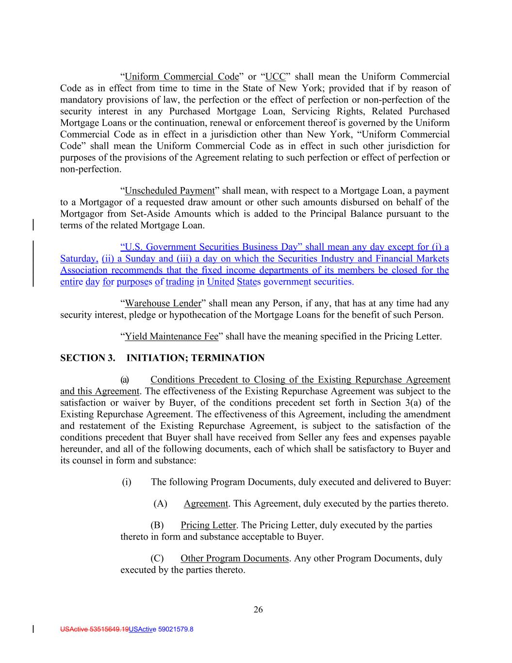 26 USActive 53515649.19USActive 59021579.8 “Uniform Commercial Code” or “UCC” shall mean the Uniform Commercial Code as in effect from time to time in the State of New York; provided that if by reason of mandatory provisions of law, the perfection or the effect of perfection or non-perfection of the security interest in any Purchased Mortgage Loan, Servicing Rights, Related Purchased Mortgage Loans or the continuation, renewal or enforcement thereof is governed by the Uniform Commercial Code as in effect in a jurisdiction other than New York, “Uniform Commercial Code” shall mean the Uniform Commercial Code as in effect in such other jurisdiction for purposes of the provisions of the Agreement relating to such perfection or effect of perfection or non-perfection. “Unscheduled Payment” shall mean, with respect to a Mortgage Loan, a payment to a Mortgagor of a requested draw amount or other such amounts disbursed on behalf of the Mortgagor from Set-Aside Amounts which is added to the Principal Balance pursuant to the terms of the related Mortgage Loan. “U.S. Government Securities Business Day” shall mean any day except for (i) a Saturday, (ii) a Sunday and (iii) a day on which the Securities Industry and Financial Markets Association recommends that the fixed income departments of its members be closed for the entire day for purposes of trading in United States government securities. “Warehouse Lender” shall mean any Person, if any, that has at any time had any security interest, pledge or hypothecation of the Mortgage Loans for the benefit of such Person. “Yield Maintenance Fee” shall have the meaning specified in the Pricing Letter. SECTION 3. INITIATION; TERMINATION (a) Conditions Precedent to Closing of the Existing Repurchase Agreement and this Agreement. The effectiveness of the Existing Repurchase Agreement was subject to the satisfaction or waiver by Buyer, of the conditions precedent set forth in Section 3(a) of the Existing Repurchase Agreement. The effectiveness of this Agreement, including the amendment and restatement of the Existing Repurchase Agreement, is subject to the satisfaction of the conditions precedent that Buyer shall have received from Seller any fees and expenses payable hereunder, and all of the following documents, each of which shall be satisfactory to Buyer and its counsel in form and substance: (i) The following Program Documents, duly executed and delivered to Buyer: (A) Agreement. This Agreement, duly executed by the parties thereto. (B) Pricing Letter. The Pricing Letter, duly executed by the parties thereto in form and substance acceptable to Buyer. (C) Other Program Documents. Any other Program Documents, duly executed by the parties thereto.