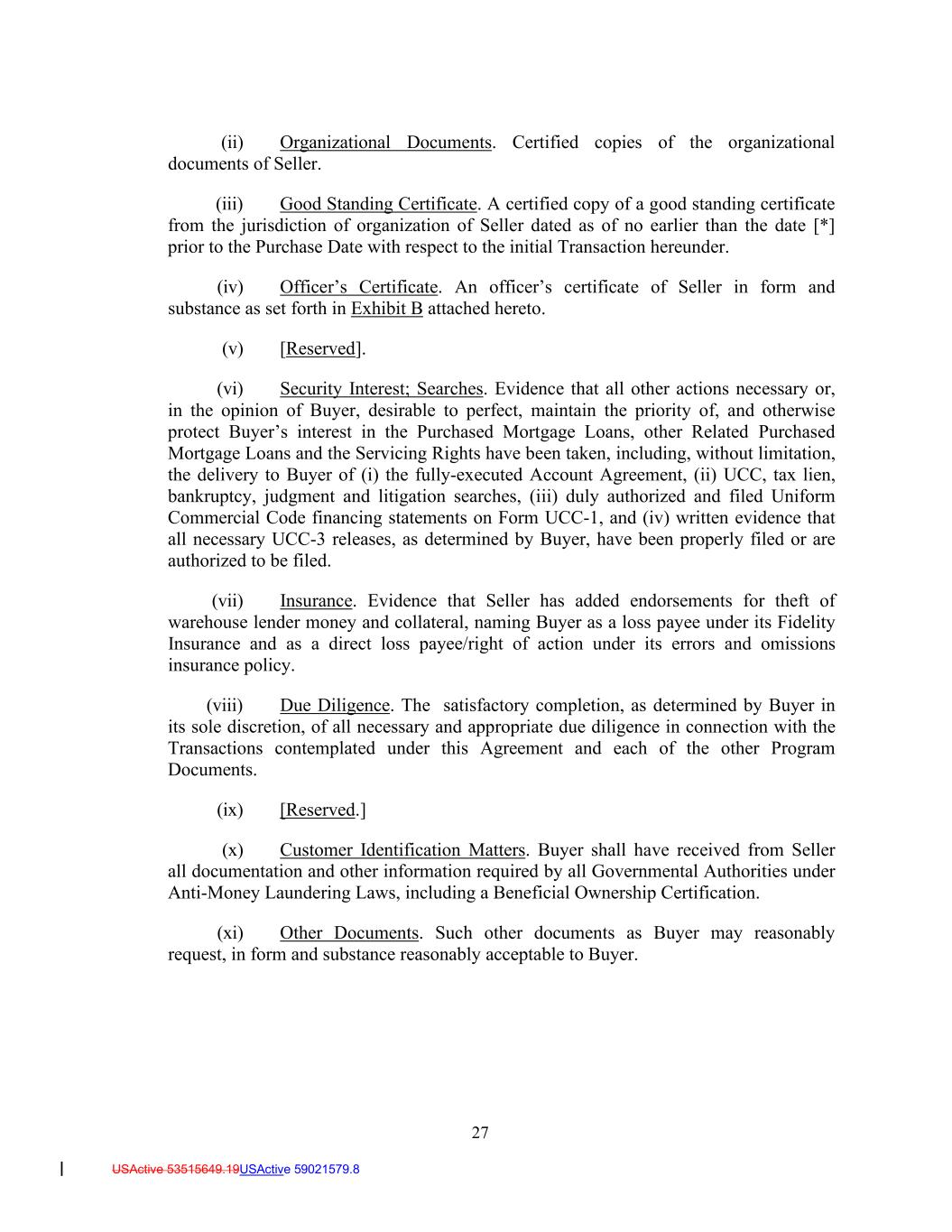 27 USActive 53515649.19USActive 59021579.8 (ii) Organizational Documents. Certified copies of the organizational documents of Seller. (iii) Good Standing Certificate. A certified copy of a good standing certificate from the jurisdiction of organization of Seller dated as of no earlier than the date [*] prior to the Purchase Date with respect to the initial Transaction hereunder. (iv) Officer’s Certificate. An officer’s certificate of Seller in form and substance as set forth in Exhibit B attached hereto. (v) [Reserved]. (vi) Security Interest; Searches. Evidence that all other actions necessary or, in the opinion of Buyer, desirable to perfect, maintain the priority of, and otherwise protect Buyer’s interest in the Purchased Mortgage Loans, other Related Purchased Mortgage Loans and the Servicing Rights have been taken, including, without limitation, the delivery to Buyer of (i) the fully-executed Account Agreement, (ii) UCC, tax lien, bankruptcy, judgment and litigation searches, (iii) duly authorized and filed Uniform Commercial Code financing statements on Form UCC-1, and (iv) written evidence that all necessary UCC-3 releases, as determined by Buyer, have been properly filed or are authorized to be filed. (vii) Insurance. Evidence that Seller has added endorsements for theft of warehouse lender money and collateral, naming Buyer as a loss payee under its Fidelity Insurance and as a direct loss payee/right of action under its errors and omissions insurance policy. (viii) Due Diligence. The satisfactory completion, as determined by Buyer in its sole discretion, of all necessary and appropriate due diligence in connection with the Transactions contemplated under this Agreement and each of the other Program Documents. (ix) [Reserved.] (x) Customer Identification Matters. Buyer shall have received from Seller all documentation and other information required by all Governmental Authorities under Anti-Money Laundering Laws, including a Beneficial Ownership Certification. (xi) Other Documents. Such other documents as Buyer may reasonably request, in form and substance reasonably acceptable to Buyer.