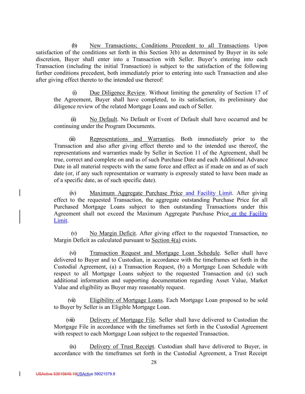 28 USActive 53515649.19USActive 59021579.8 (b) New Transactions; Conditions Precedent to all Transactions. Upon satisfaction of the conditions set forth in this Section 3(b) as determined by Buyer in its sole discretion, Buyer shall enter into a Transaction with Seller. Buyer’s entering into each Transaction (including the initial Transaction) is subject to the satisfaction of the following further conditions precedent, both immediately prior to entering into such Transaction and also after giving effect thereto to the intended use thereof: (i) Due Diligence Review. Without limiting the generality of Section 17 of the Agreement, Buyer shall have completed, to its satisfaction, its preliminary due diligence review of the related Mortgage Loans and each of Seller. (ii) No Default. No Default or Event of Default shall have occurred and be continuing under the Program Documents. (iii) Representations and Warranties. Both immediately prior to the Transaction and also after giving effect thereto and to the intended use thereof, the representations and warranties made by Seller in Section 11 of the Agreement, shall be true, correct and complete on and as of such Purchase Date and each Additional Advance Date in all material respects with the same force and effect as if made on and as of such date (or, if any such representation or warranty is expressly stated to have been made as of a specific date, as of such specific date). (iv) Maximum Aggregate Purchase Price and Facility Limit. After giving effect to the requested Transaction, the aggregate outstanding Purchase Price for all Purchased Mortgage Loans subject to then outstanding Transactions under this Agreement shall not exceed the Maximum Aggregate Purchase Price or the Facility Limit. (v) No Margin Deficit. After giving effect to the requested Transaction, no Margin Deficit as calculated pursuant to Section 4(a) exists. (vi) Transaction Request and Mortgage Loan Schedule. Seller shall have delivered to Buyer and to Custodian, in accordance with the timeframes set forth in the Custodial Agreement, (a) a Transaction Request, (b) a Mortgage Loan Schedule with respect to all Mortgage Loans subject to the requested Transaction and (c) such additional information and supporting documentation regarding Asset Value, Market Value and eligibility as Buyer may reasonably request. (vii) Eligibility of Mortgage Loans. Each Mortgage Loan proposed to be sold to Buyer by Seller is an Eligible Mortgage Loan. (viii) Delivery of Mortgage File. Seller shall have delivered to Custodian the Mortgage File in accordance with the timeframes set forth in the Custodial Agreement with respect to each Mortgage Loan subject to the requested Transaction. (ix) Delivery of Trust Receipt. Custodian shall have delivered to Buyer, in accordance with the timeframes set forth in the Custodial Agreement, a Trust Receipt