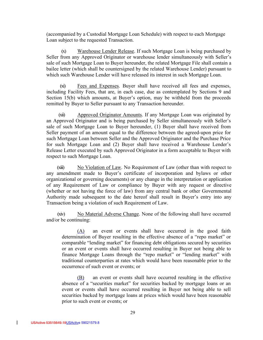 29 USActive 53515649.19USActive 59021579.8 (accompanied by a Custodial Mortgage Loan Schedule) with respect to each Mortgage Loan subject to the requested Transaction. (x) Warehouse Lender Release. If such Mortgage Loan is being purchased by Seller from any Approved Originator or warehouse lender simultaneously with Seller’s sale of such Mortgage Loan to Buyer hereunder, the related Mortgage File shall contain a bailee letter (which shall be countersigned by the related Warehouse Lender) pursuant to which such Warehouse Lender will have released its interest in such Mortgage Loan. (xi) Fees and Expenses. Buyer shall have received all fees and expenses, including Facility Fees, that are, in each case, due as contemplated by Sections 9 and Section 15(b) which amounts, at Buyer’s option, may be withheld from the proceeds remitted by Buyer to Seller pursuant to any Transaction hereunder. (xii) Approved Originator Amounts. If any Mortgage Loan was originated by an Approved Originator and is being purchased by Seller simultaneously with Seller’s sale of such Mortgage Loan to Buyer hereunder, (1) Buyer shall have received from Seller payment of an amount equal to the difference between the agreed-upon price for such Mortgage Loan between Seller and the Approved Originator and the Purchase Price for such Mortgage Loan and (2) Buyer shall have received a Warehouse Lender’s Release Letter executed by such Approved Originator in a form acceptable to Buyer with respect to such Mortgage Loan. (xiii) No Violation of Law. No Requirement of Law (other than with respect to any amendment made to Buyer’s certificate of incorporation and bylaws or other organizational or governing documents) or any change in the interpretation or application of any Requirement of Law or compliance by Buyer with any request or directive (whether or not having the force of law) from any central bank or other Governmental Authority made subsequent to the date hereof shall result in Buyer’s entry into any Transaction being a violation of such Requirement of Law. (xiv) No Material Adverse Change. None of the following shall have occurred and/or be continuing: (A) an event or events shall have occurred in the good faith determination of Buyer resulting in the effective absence of a “repo market” or comparable “lending market” for financing debt obligations secured by securities or an event or events shall have occurred resulting in Buyer not being able to finance Mortgage Loans through the “repo market” or “lending market” with traditional counterparties at rates which would have been reasonable prior to the occurrence of such event or events; or (B) an event or events shall have occurred resulting in the effective absence of a “securities market” for securities backed by mortgage loans or an event or events shall have occurred resulting in Buyer not being able to sell securities backed by mortgage loans at prices which would have been reasonable prior to such event or events; or