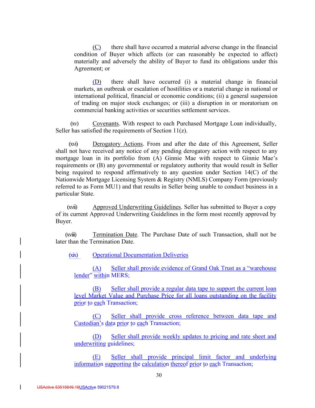 30 USActive 53515649.19USActive 59021579.8 (C) there shall have occurred a material adverse change in the financial condition of Buyer which affects (or can reasonably be expected to affect) materially and adversely the ability of Buyer to fund its obligations under this Agreement; or (D) there shall have occurred (i) a material change in financial markets, an outbreak or escalation of hostilities or a material change in national or international political, financial or economic conditions; (ii) a general suspension of trading on major stock exchanges; or (iii) a disruption in or moratorium on commercial banking activities or securities settlement services. (xv) Covenants. With respect to each Purchased Mortgage Loan individually, Seller has satisfied the requirements of Section 11(z). (xvi) Derogatory Actions. From and after the date of this Agreement, Seller shall not have received any notice of any pending derogatory action with respect to any mortgage loan in its portfolio from (A) Ginnie Mae with respect to Ginnie Mae’s requirements or (B) any governmental or regulatory authority that would result in Seller being required to respond affirmatively to any question under Section 14(C) of the Nationwide Mortgage Licensing System & Registry (NMLS) Company Form (previously referred to as Form MU1) and that results in Seller being unable to conduct business in a particular State. (xvii) Approved Underwriting Guidelines. Seller has submitted to Buyer a copy of its current Approved Underwriting Guidelines in the form most recently approved by Buyer. (xviii) Termination Date. The Purchase Date of such Transaction, shall not be later than the Termination Date. (xix) Operational Documentation Deliveries (A) Seller shall provide evidence of Grand Oak Trust as a “warehouse lender” within MERS; (B) Seller shall provide a regular data tape to support the current loan level Market Value and Purchase Price for all loans outstanding on the facility prior to each Transaction; (C) Seller shall provide cross reference between data tape and Custodian’s data prior to each Transaction; (D) Seller shall provide weekly updates to pricing and rate sheet and underwriting guidelines; (E) Seller shall provide principal limit factor and underlying information supporting the calculation thereof prior to each Transaction;