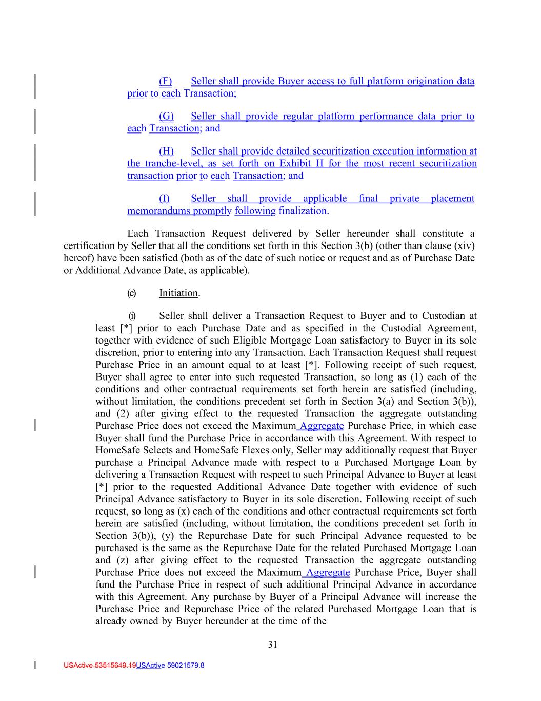 31 USActive 53515649.19USActive 59021579.8 (F) Seller shall provide Buyer access to full platform origination data prior to each Transaction; (G) Seller shall provide regular platform performance data prior to each Transaction; and (H) Seller shall provide detailed securitization execution information at the tranche-level, as set forth on Exhibit H for the most recent securitization transaction prior to each Transaction; and (I) Seller shall provide applicable final private placement memorandums promptly following finalization. Each Transaction Request delivered by Seller hereunder shall constitute a certification by Seller that all the conditions set forth in this Section 3(b) (other than clause (xiv) hereof) have been satisfied (both as of the date of such notice or request and as of Purchase Date or Additional Advance Date, as applicable). (c) Initiation. (i) Seller shall deliver a Transaction Request to Buyer and to Custodian at least [*] prior to each Purchase Date and as specified in the Custodial Agreement, together with evidence of such Eligible Mortgage Loan satisfactory to Buyer in its sole discretion, prior to entering into any Transaction. Each Transaction Request shall request Purchase Price in an amount equal to at least [*]. Following receipt of such request, Buyer shall agree to enter into such requested Transaction, so long as (1) each of the conditions and other contractual requirements set forth herein are satisfied (including, without limitation, the conditions precedent set forth in Section 3(a) and Section 3(b)), and (2) after giving effect to the requested Transaction the aggregate outstanding Purchase Price does not exceed the Maximum Aggregate Purchase Price, in which case Buyer shall fund the Purchase Price in accordance with this Agreement. With respect to HomeSafe Selects and HomeSafe Flexes only, Seller may additionally request that Buyer purchase a Principal Advance made with respect to a Purchased Mortgage Loan by delivering a Transaction Request with respect to such Principal Advance to Buyer at least [*] prior to the requested Additional Advance Date together with evidence of such Principal Advance satisfactory to Buyer in its sole discretion. Following receipt of such request, so long as (x) each of the conditions and other contractual requirements set forth herein are satisfied (including, without limitation, the conditions precedent set forth in Section 3(b)), (y) the Repurchase Date for such Principal Advance requested to be purchased is the same as the Repurchase Date for the related Purchased Mortgage Loan and (z) after giving effect to the requested Transaction the aggregate outstanding Purchase Price does not exceed the Maximum Aggregate Purchase Price, Buyer shall fund the Purchase Price in respect of such additional Principal Advance in accordance with this Agreement. Any purchase by Buyer of a Principal Advance will increase the Purchase Price and Repurchase Price of the related Purchased Mortgage Loan that is already owned by Buyer hereunder at the time of the